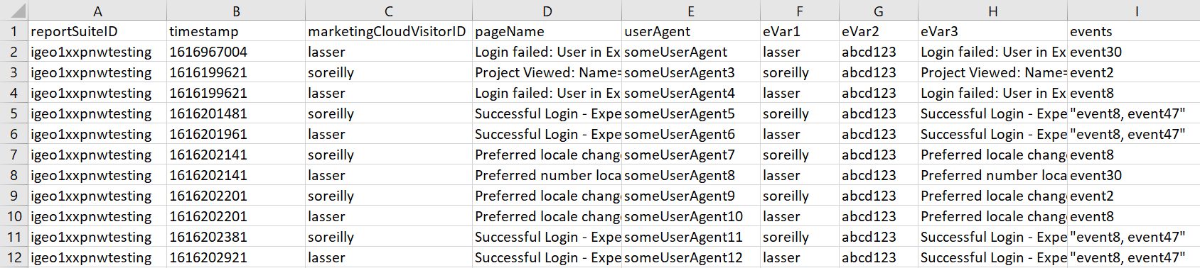 - marketingCloudVisitorID (Required) and 1 eVar: Set with log field 'Login'. NOTE: if your organization uses email addresses as login IDs, scrub the email addresses at this time before inserting into your input file. Replace with first & last name, or simply remove the "@abc.com" portion of the string.