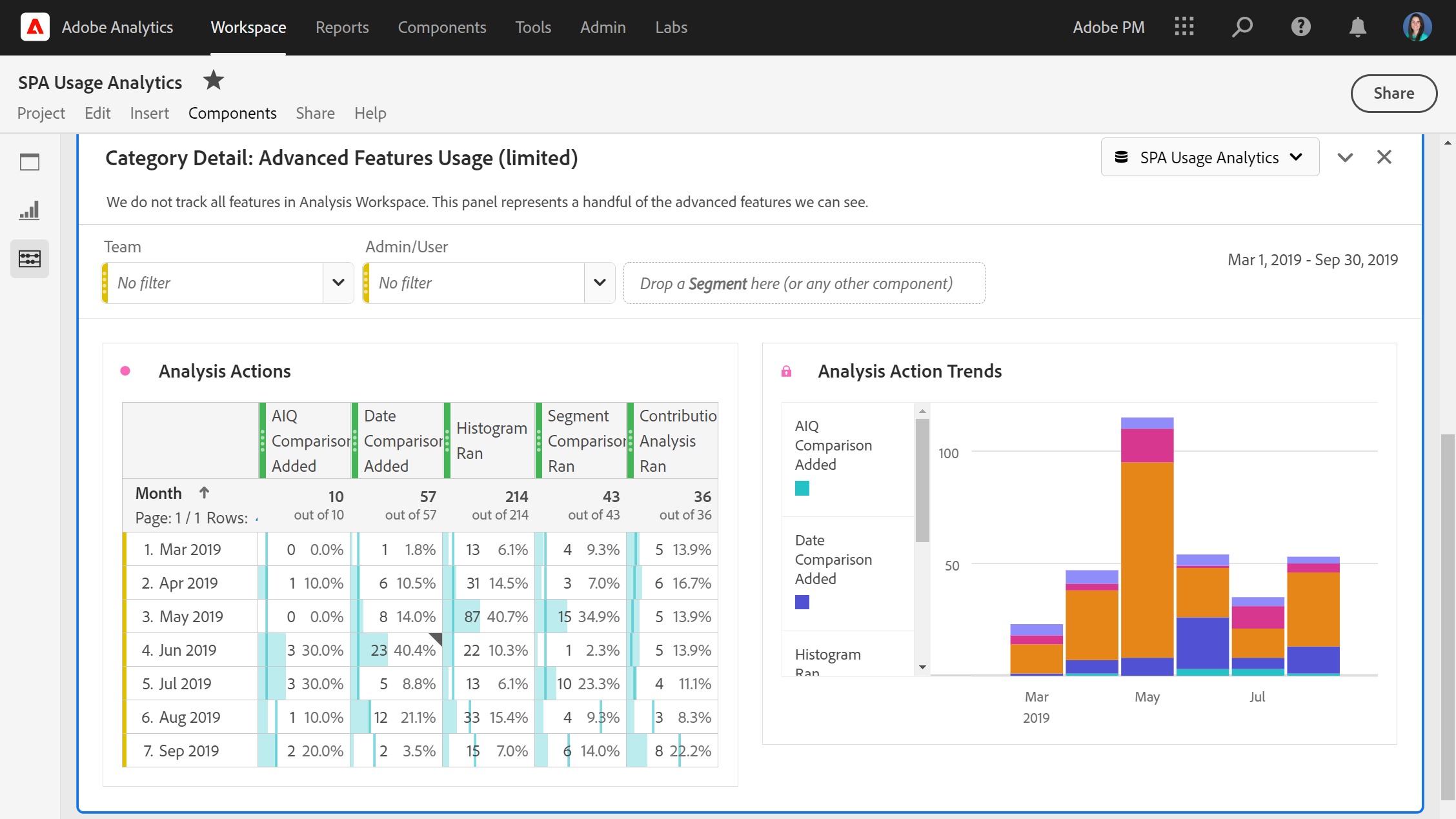Although the log tracking is more sparse, you can measure certain features used within Workspace based on the log events that are registered. Features include Contribution Analysis, Segment Comparison, Histograms, Right-click > Attribution IQ comparison added, and Right-click > Date Comparisons.