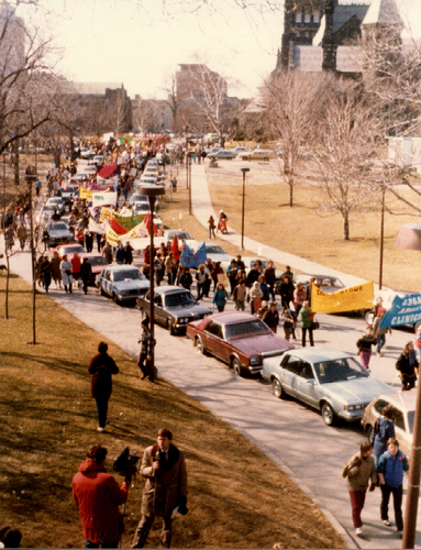Crédit photo : Pelletier, Johanne. Participantes sur le campus de l'Université de Toronto lors de la manifestation de la Journée internationale de la femme (JIF) à Toronto en 1987. De la collection CWMA (10-001) © Archives et collections spéciales.