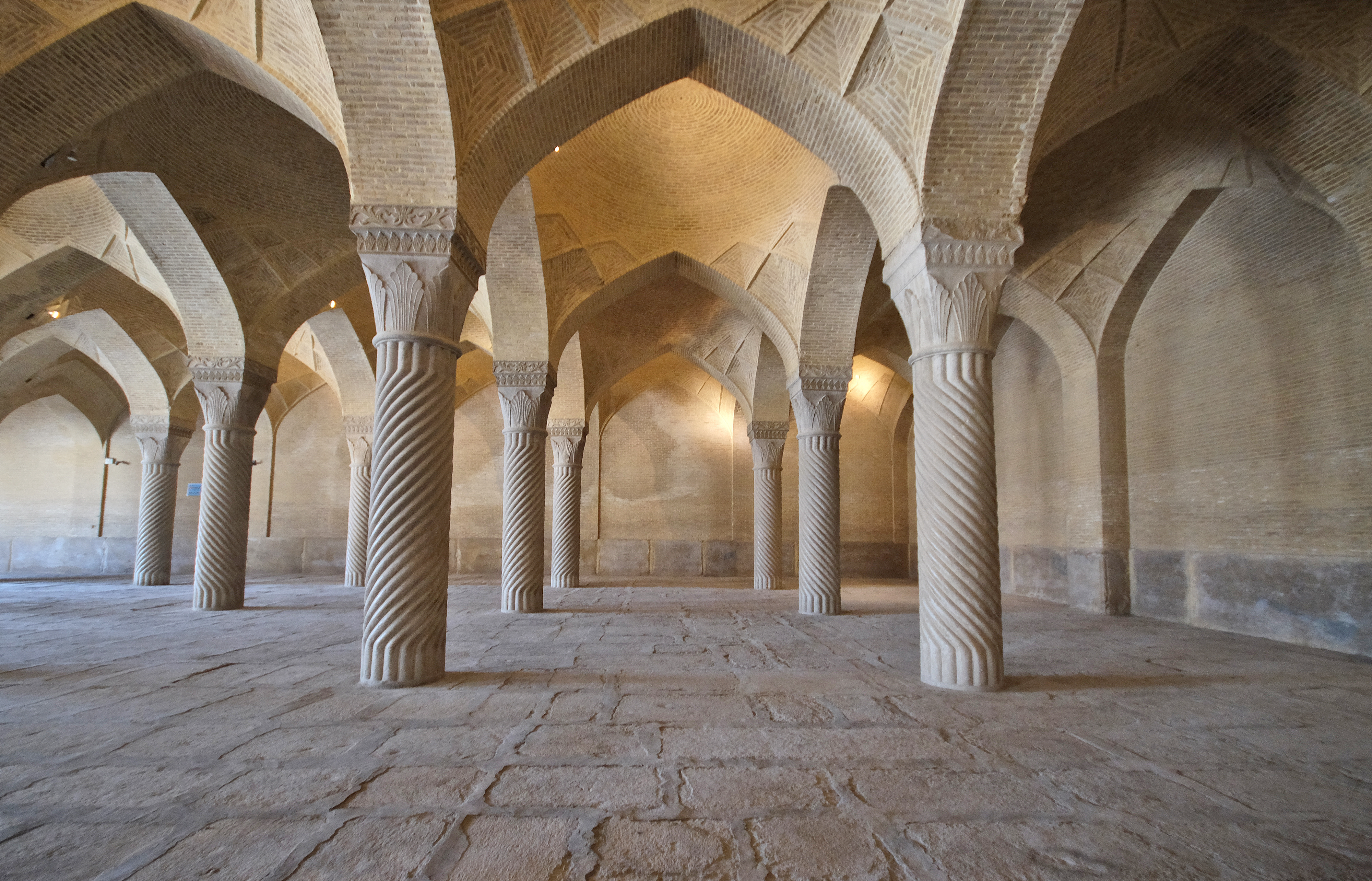 The Vakil Mosque in Shiraz is notable for its forest of 48 diagonally fluted columns, creating a mesmerizing rhythm of vertical lines and arabesques.