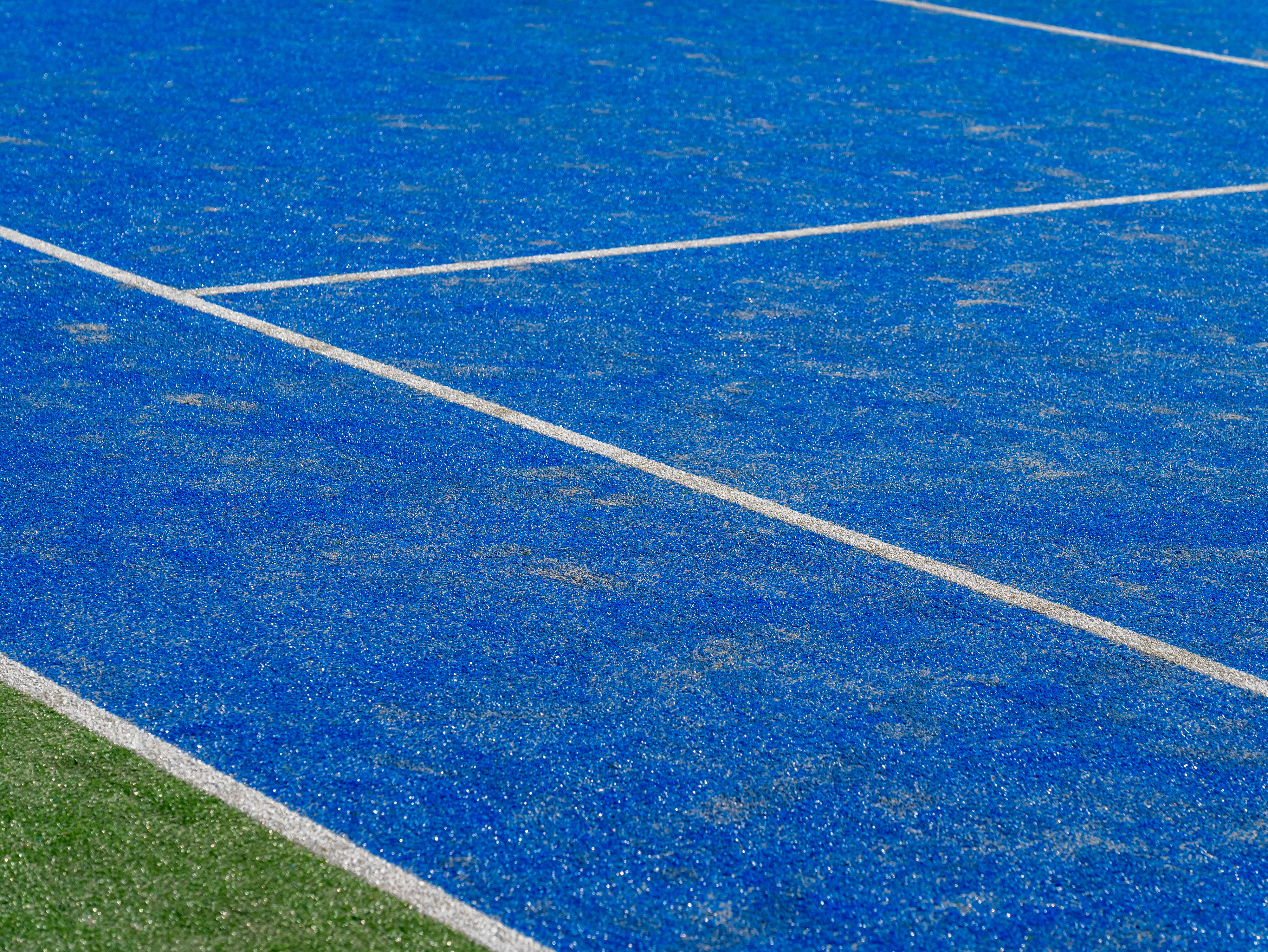 Created with an image by Matteo Ceruti - "Detail of a new synthetic tennis court.,White lines on a blue artificial grass tennis court.,Racket sports concept"