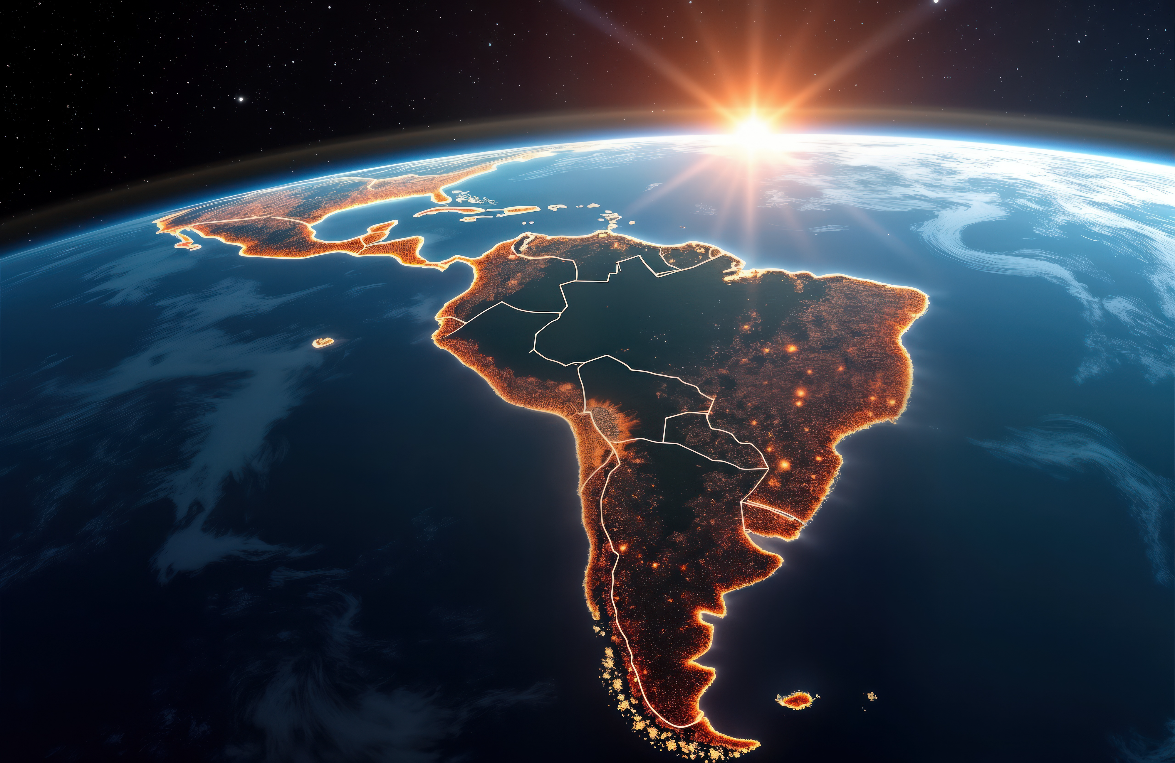 Creado con una imagen de miss irine - "Large green areas of forest.,Sunrise highlights continent features.,South America continent seen from space.,Cities glow with lights.,Global map view at sunrise.,Sunrise over planet.,International"