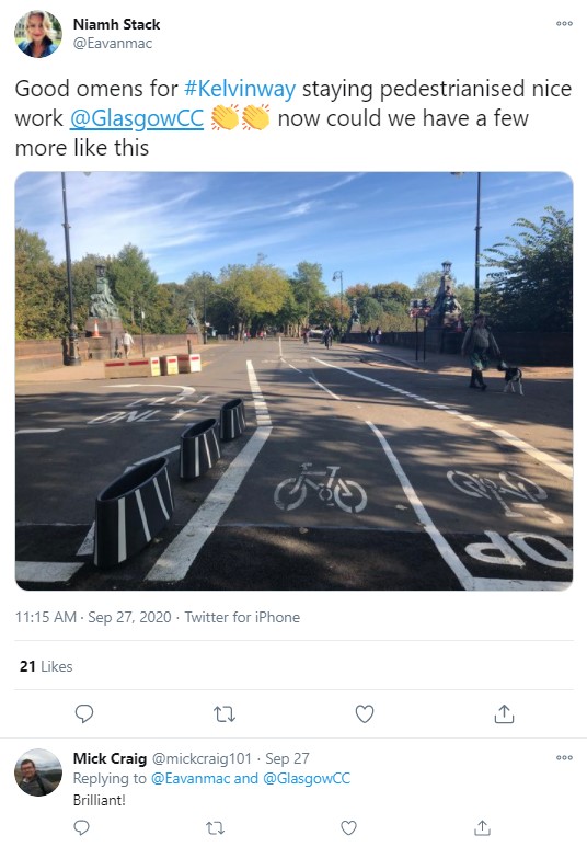 Cllr Anna Richardson, Convener for Sustainability and Carbon Reduction said: "These revisions proposed for Kelvin Way will provide a more sustainable long-term layout and ensure that those out walking, wheeling and cycling in this popular area continue to have the safer space to do so. As the Spaces for People programme develops further, we'll be seeking to improve the appearance of temporary measures where possible, and I'm really looking forward to seeing the planters installed, further enhancing the popularity of this space." (September 2020)