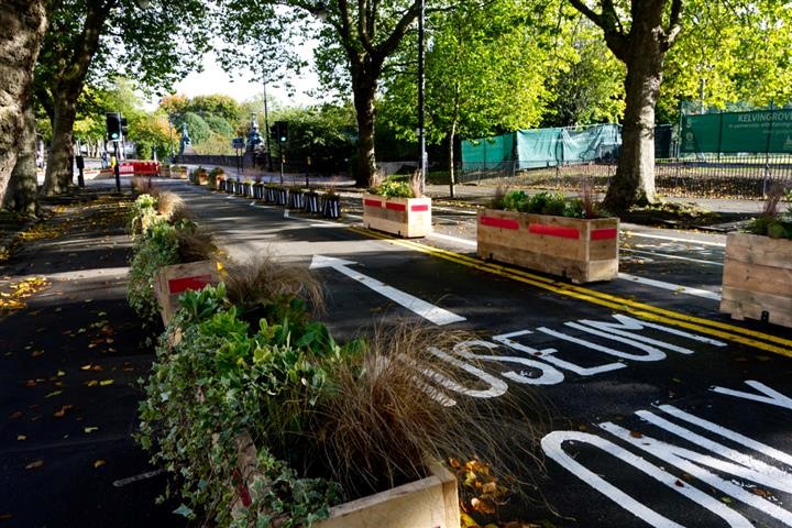 Image: Kelvin Way reconfiguration of southern section, cycle lane and planters. Photo: Glasgow City Council, September 2020