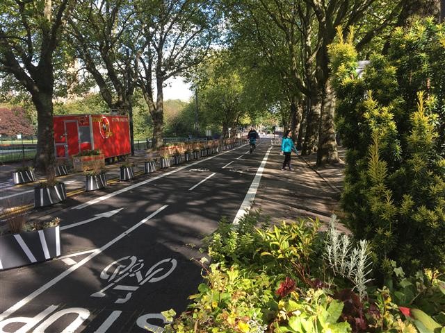Image: Kelvin Way reconfiguration of southern section - Cycle lane and planters. Photo: Glasgow City Council, September 2020