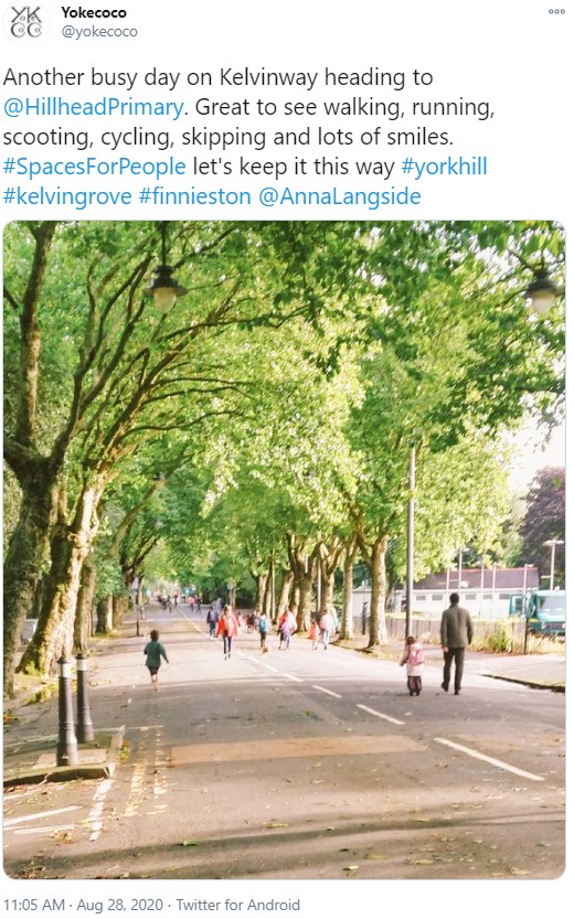 As the lockdown restrictions eased and traffic levels began to resume it was hoped this traffic free route would continue to encourage the use of active travel by those returning to work and study – for example, the staff and students of the University, and for the children attending Hillhead Primary School and Kelvin Park Early Years Centre.