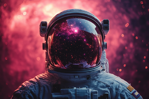 Credits: Lubos Chlubny - "Astronaut is exploring a new planet with a pink nebula reflecting in his helmet visor" and others