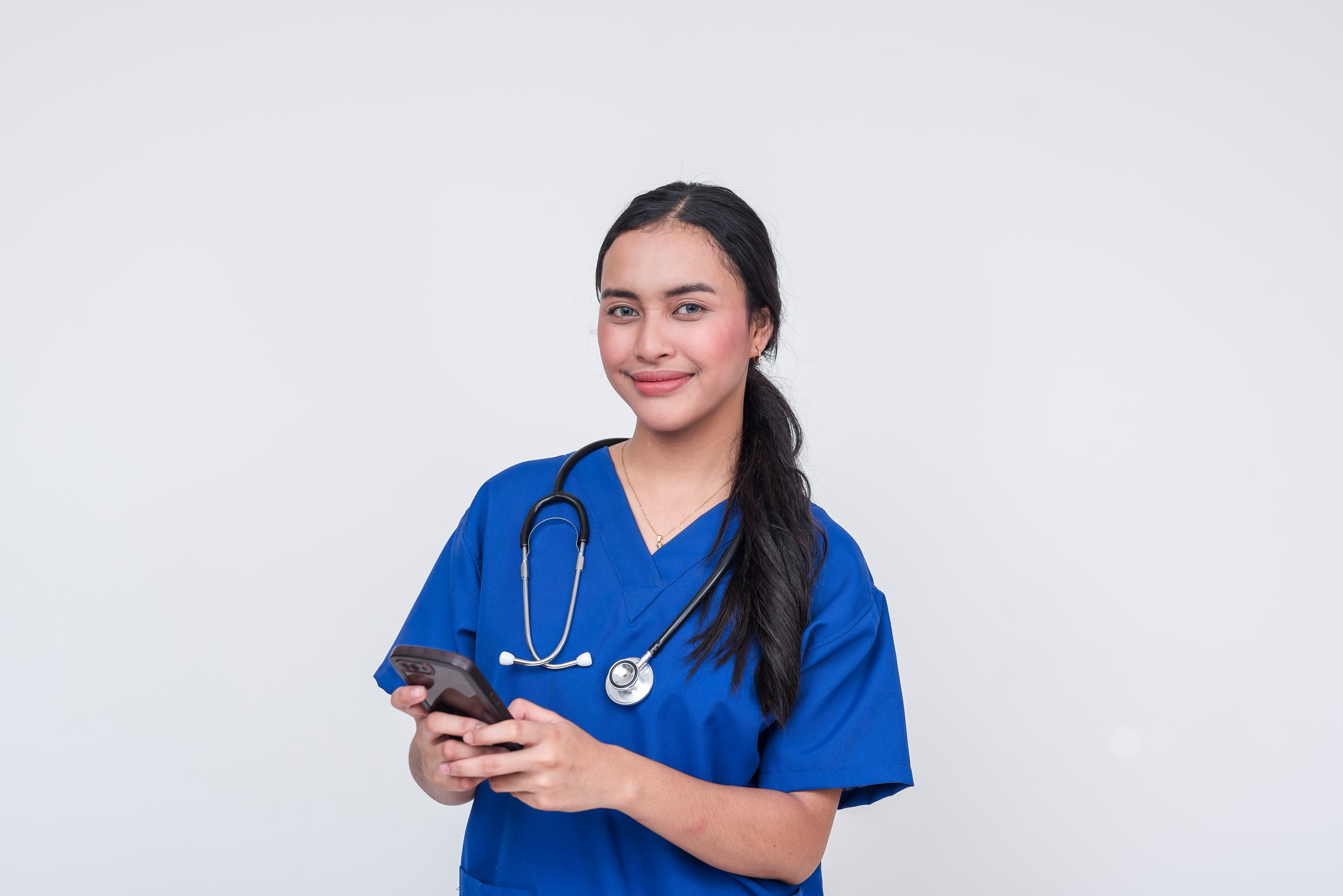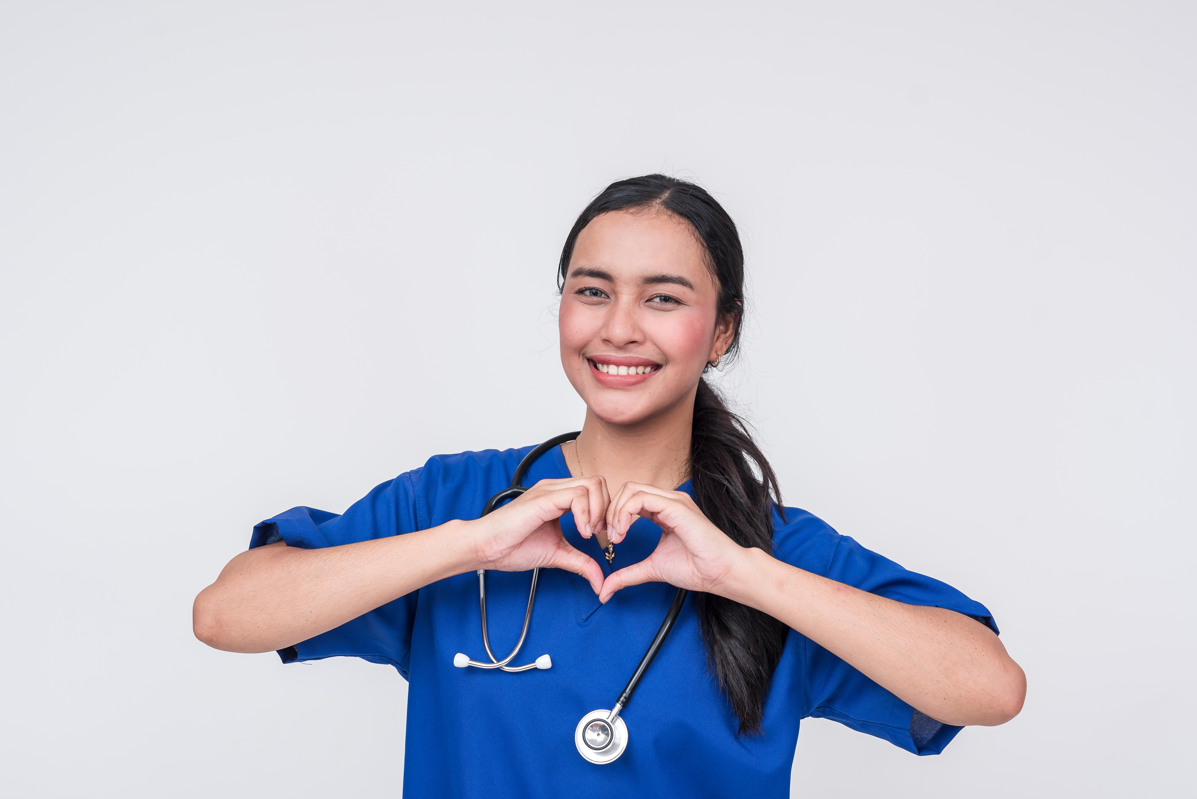 Created with images by Mdv Edwards - "Young Asian female caregiver in blue scrub suit smiling while texting on her cellphone, isolated on white background" • Mdv Edwards - "Young Asian female nurse in blue scrubs making a heart gesture, isolated on white"