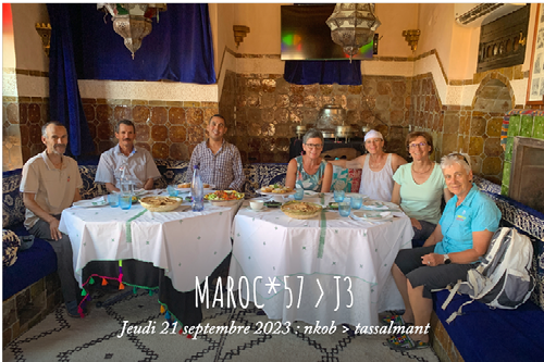 Ci-dessus : talat, dar daïf, dernier déjeuner en compagnie de nos guide, cuisinier et chauffeur !