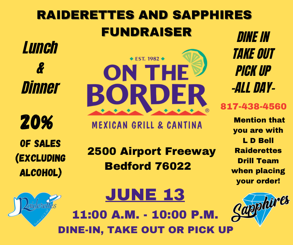 Want to get together this summer and socialize with other L. D. Bell students and their families? Join the Raiderettes at On The Border, in Bedford, on June 13 between 11 a.m. and 10 pm. Please share the flyer on social media and invite all your friends!