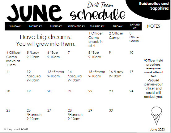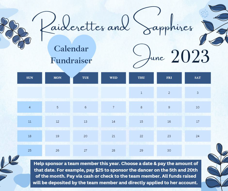 If you are still looking for sponsors or need support for drill team expenses, consider participating in the optional Calendar Fundraiser where you ask friends and family member to pick a date to donate. Janna created the calendars for Instagram and/or Facebook so you can share on your personal social media pages if you like. How does it work? Have people choose a calendar day to sponsor. They will donate the amount of money equal to the corresponding number (i.e. June 20 equals donating $20). Keep going until every day is sponsored (a person could technically sponsor more than one day if need be). You will collect the money and then submit the money to our Treasurer, Shannon or Assistant Misty on July 11 at Practice Wear Pick Up so it can be credited to your daughter's account.