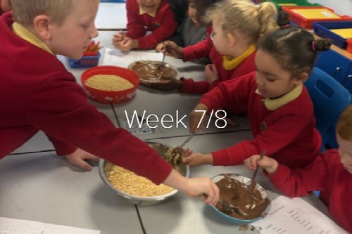 English - We invited the nursery children to join us in English this week! We used our recipes we created last week to make Rice Krispie cakes. We had so much fun helping the nursery children make these - the cakes were delicious!