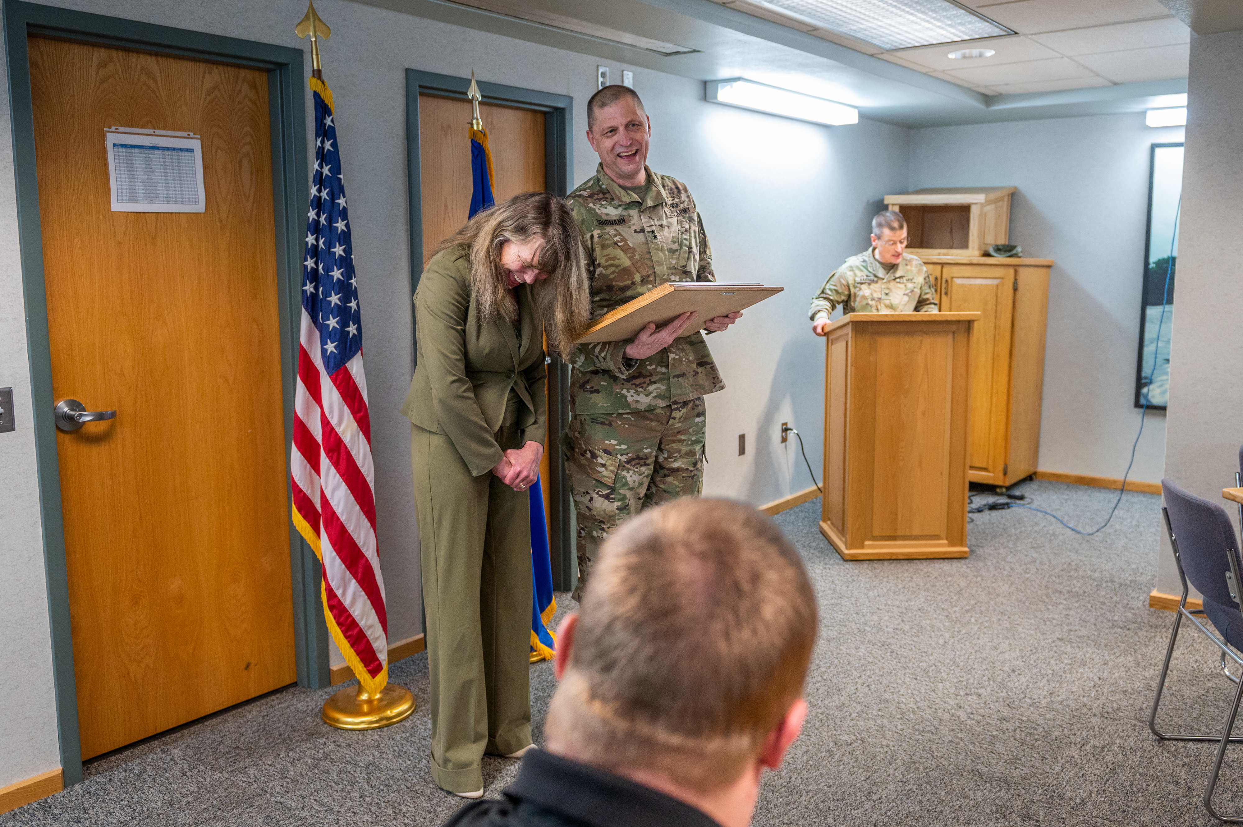 Retired Command Sgt. Maj. Darcy Schwind, reacts to Maj. Gen. Al Dohrmann's comments during the presentation of the State Meritorious Service Medal at Fraine Barracks, March 24.