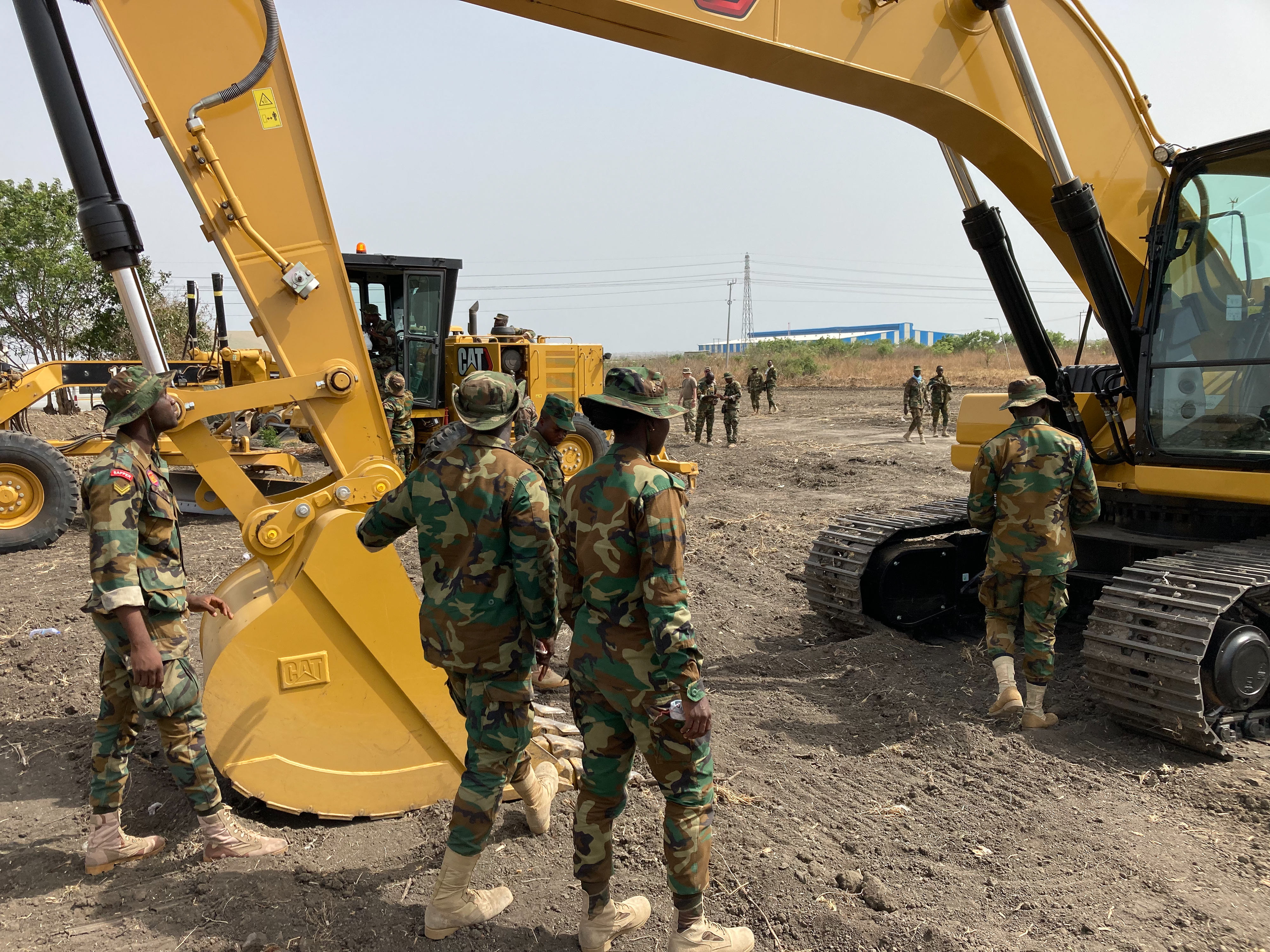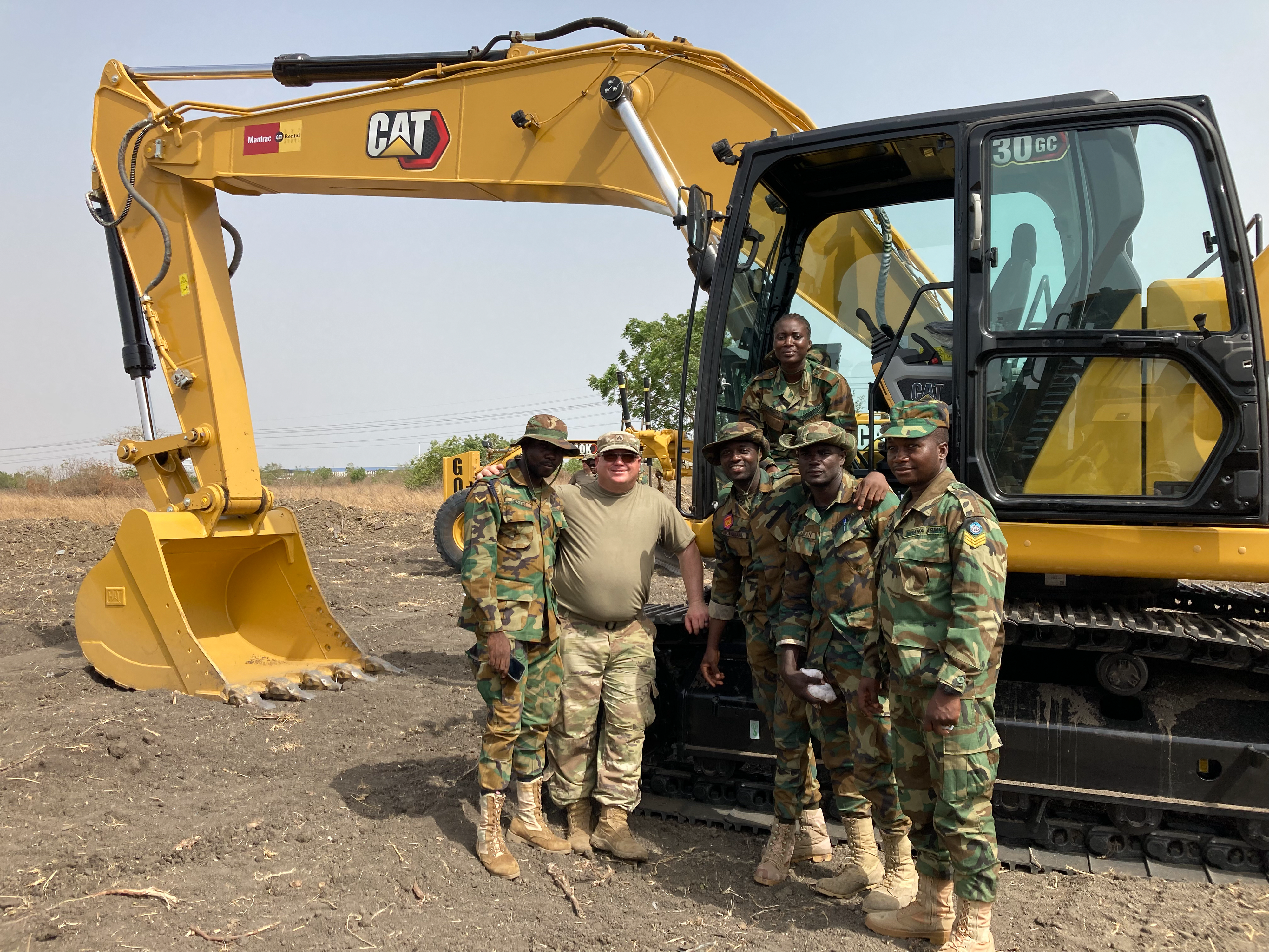 Sgt. Ryan Sott, 815th Engineer Company, with engineers from the Ghana Armed Forces at the Bundase Training Camp in Ghana, March 18, 2022. Warrant Officer First Class Stanley Agrah, lead instructor with the Ghana Armed Forces Engineer Training School, stands to the far right and Private Avorkpo Benedicta sits on the hydraulic excavator.