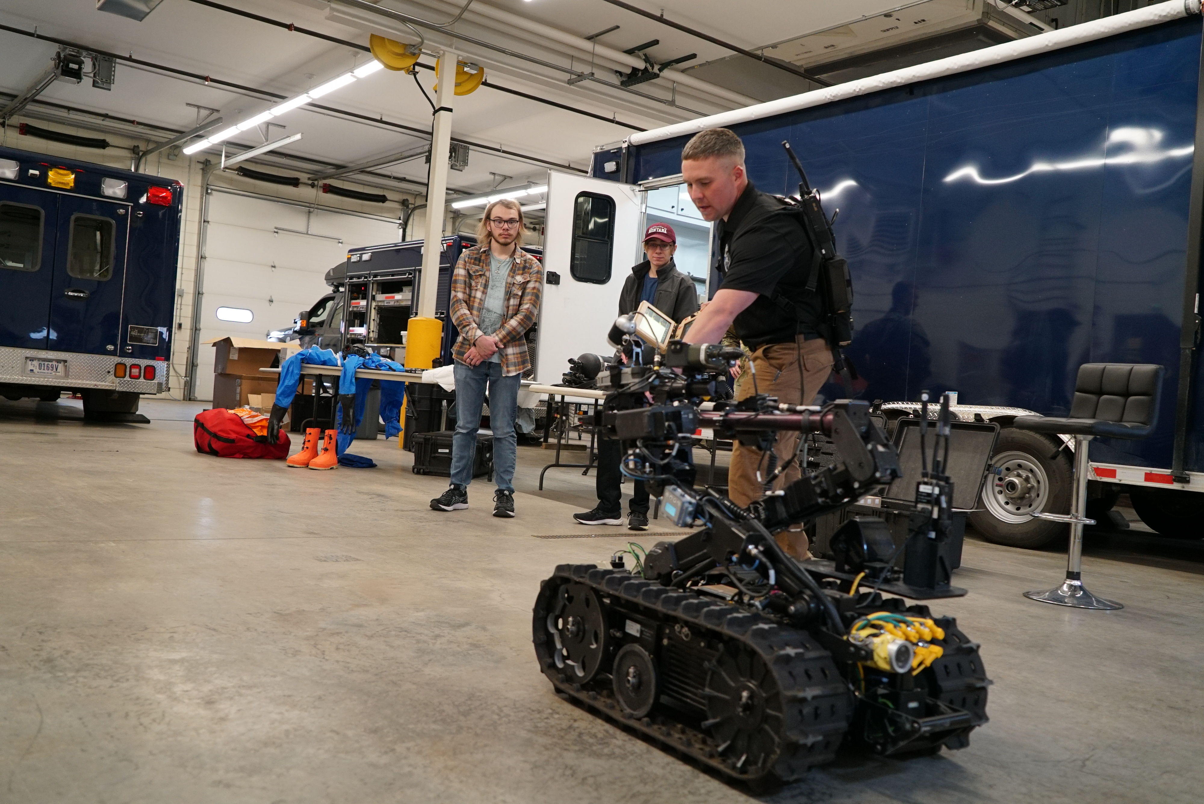 Sgt. Brent Lafontaine, 81st Civil Support Team, shows Bismarck State College students a TALON Tracked Military Robot at Fraine Barracks in Bismarck, March 29, 2022.