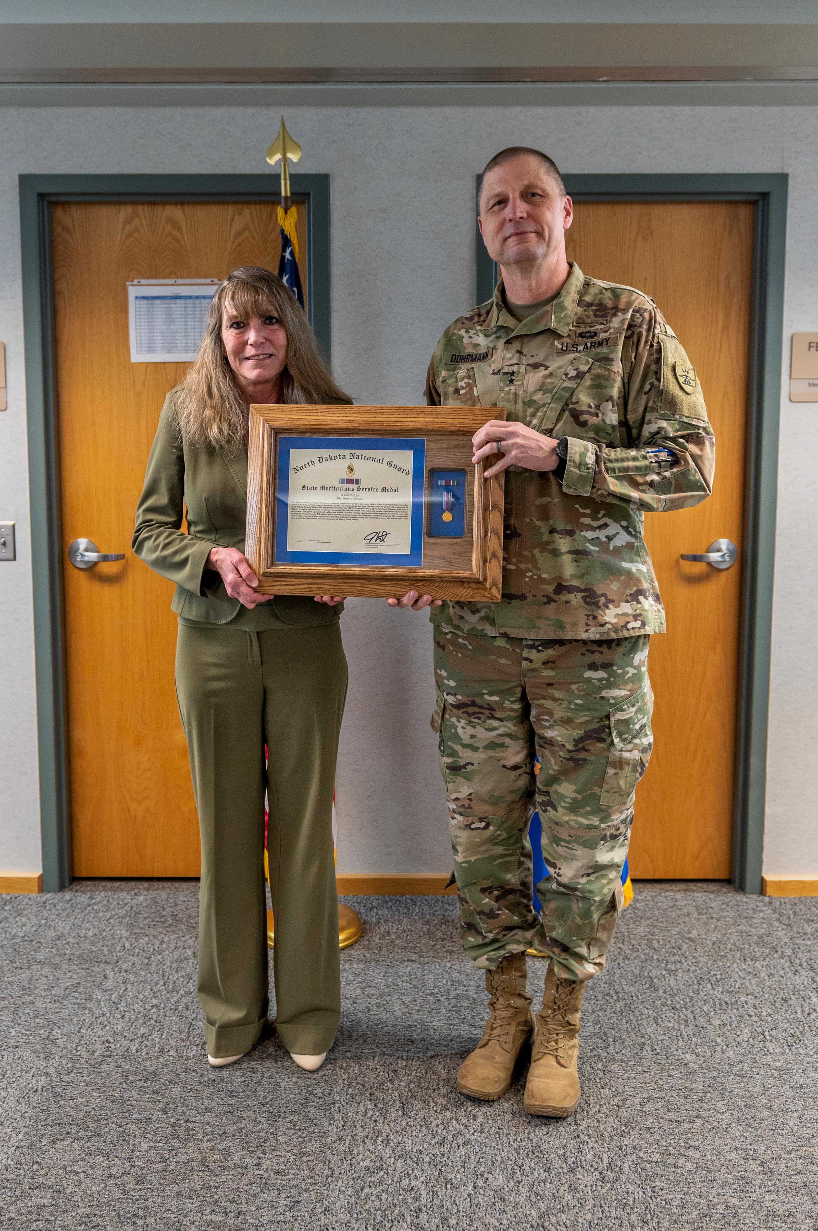 Schwind, who served in the National Guard for over 36 years before retiring in 2018, began working for the PFO in 2005 and continued there for 17 years, working alongside Col. Paul Harron, Grants Officer, as the Grants Officer Representative. She was presented the State Meritorious Service Medal by Maj. Gen. Al Dohrmann, N.D. National Guard adjutant general.