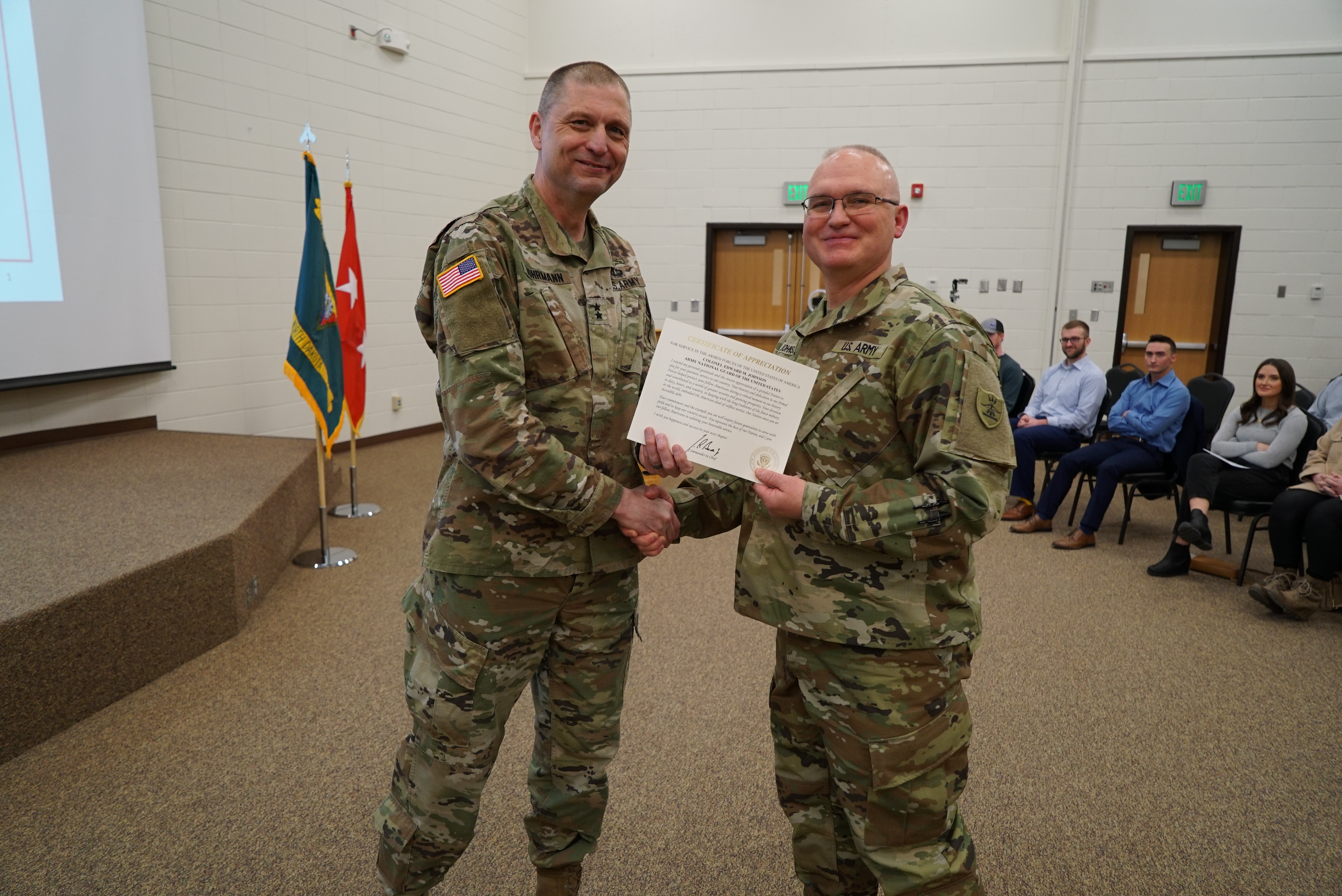 Maj. Gen. Al Dohrmann, N.D. National Guard adjutant general, presents Col. Ed Johnson, commander of Camp Grafton Training Center (CGTC), a certificate of retirement, CGTC, March 26, 2022.