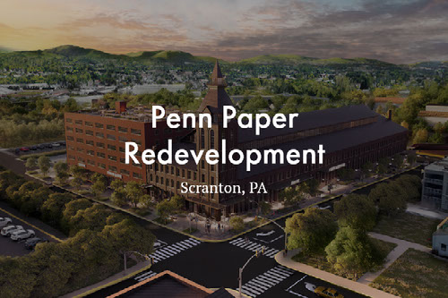 Martina Bacarella Architect (MBA) embraces complex, sustainability-driven, and community-oriented projects as opportunities to build deep technical expertise and deliver high-quality design solutions. The Penn Paper Building at 225 Vine Street, formerly known as the Dickson Works or more widely recognized as the Dunder Mifflin Paper Company from “The Office” and the adjoining A&P Bakery Building at 215 Vine Street, are historic landmarks in downtown Scranton. These iconic structures, totaling approximately 160,000 square feet are undergoing redevelopment into residential apartments. The Penn Paper building is deeply rooted in Scranton’s industrial history, originally serving as the manufacturing facility for rail engines, with locomotives placed directly onto the train line passing behind the building. The building retains much of its original structure, including brick masonry and bluestone.