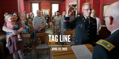 Retired Lt. Col. Mark Tibor, right, administers the oath of office to his son Kellen Tibor during his commissioning ceremony at the North Dakota Former Governor's Mansion, Bismarck, April 18, 2022.