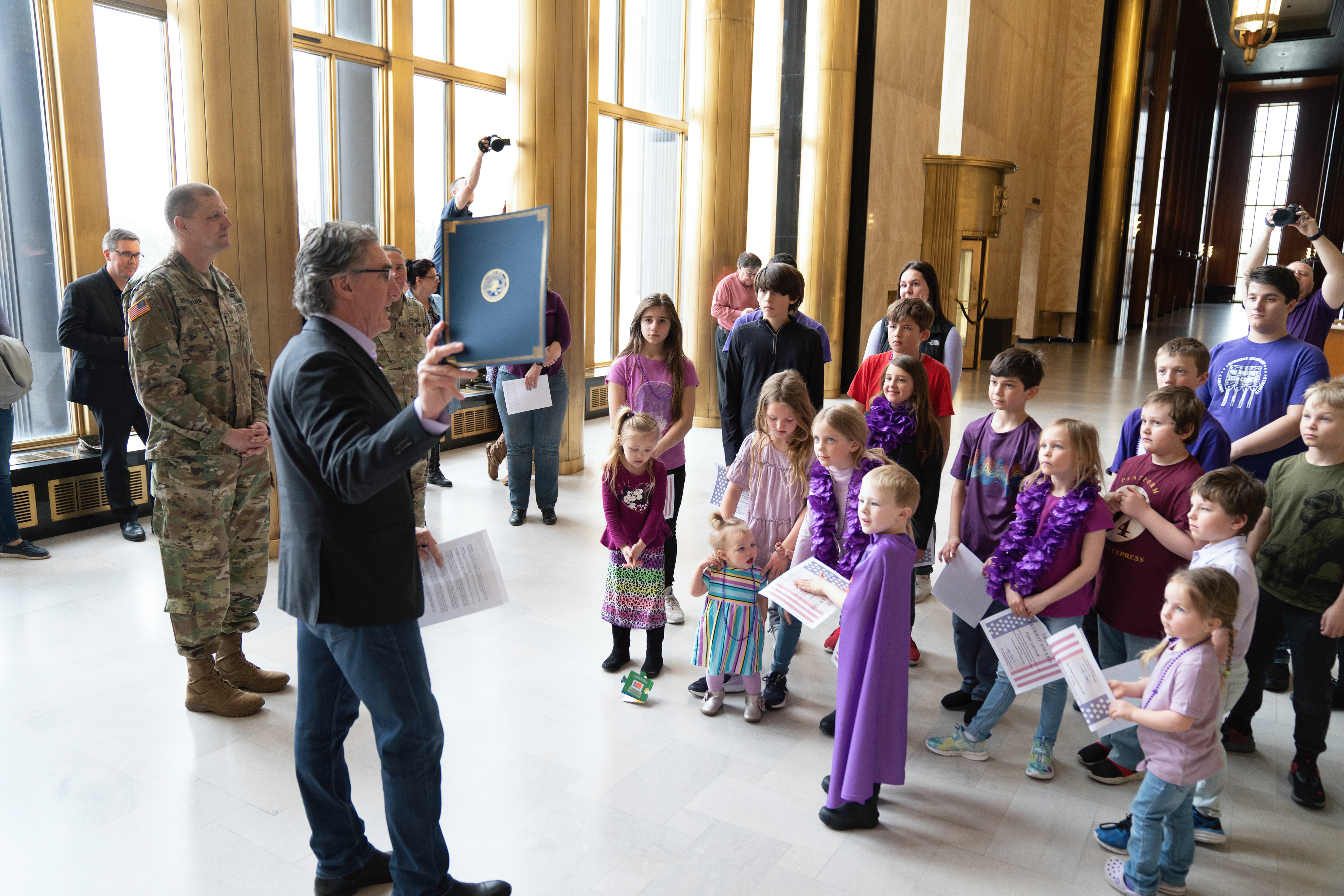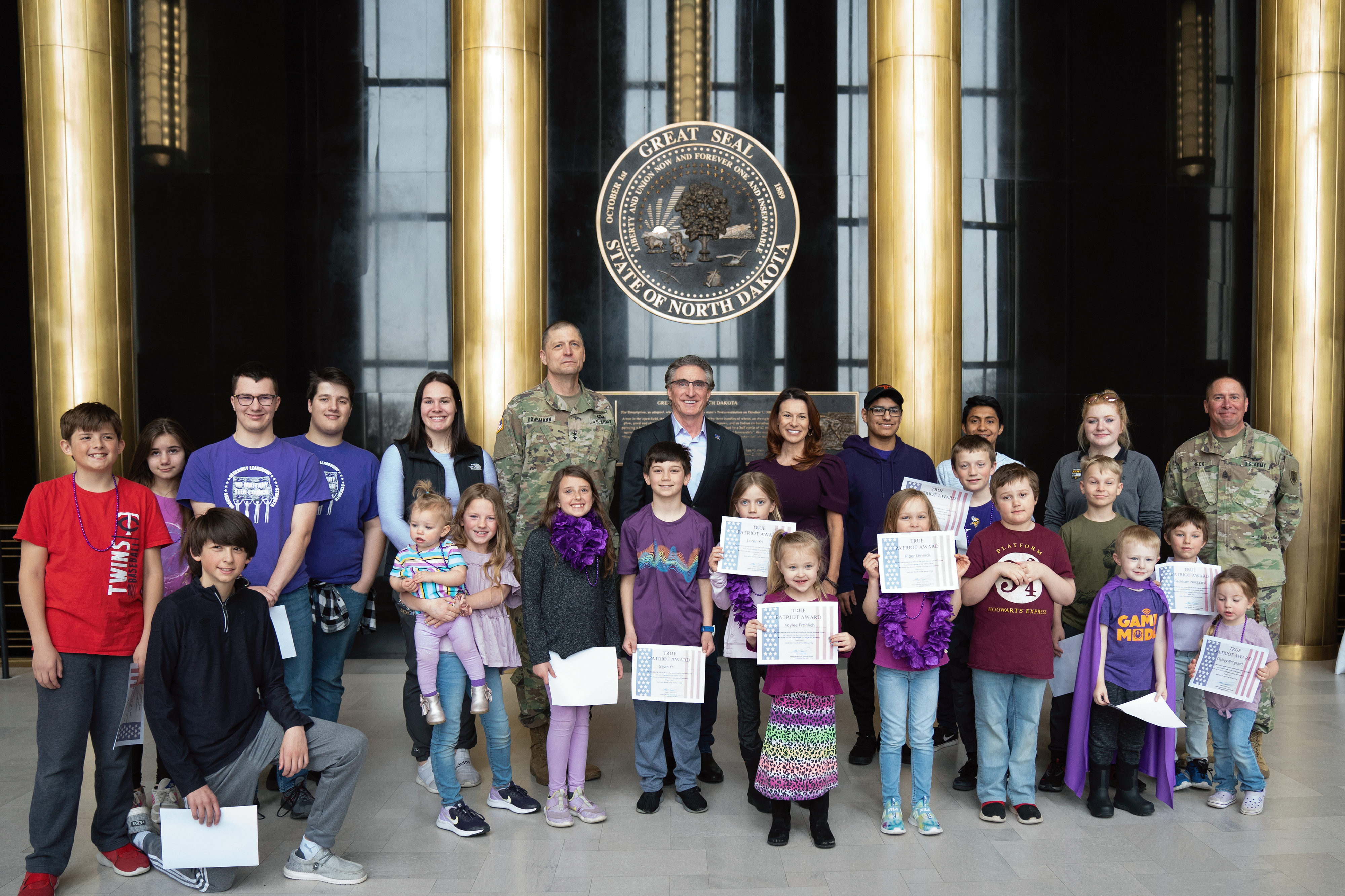 In recognition of the Month of the Military Child, Gov. Doug Burgum, commander-in-chief of the N.D. National Guard, joined Maj. Gen. Al Dohrmann, N.D. adjutant general, Kirsten Baesler, North Dakota Department of Public Instruction superintendent, and Command Sgt. Maj. Derek Heck, N.D. state command sergeant major, in honoring military children at Memorial Hall, N.D. Capitol, Bismarck, April 21, 2021. (National Guard story and photos by Cpt. Vanessa Lennick, N.D. National Guard Visual Information)