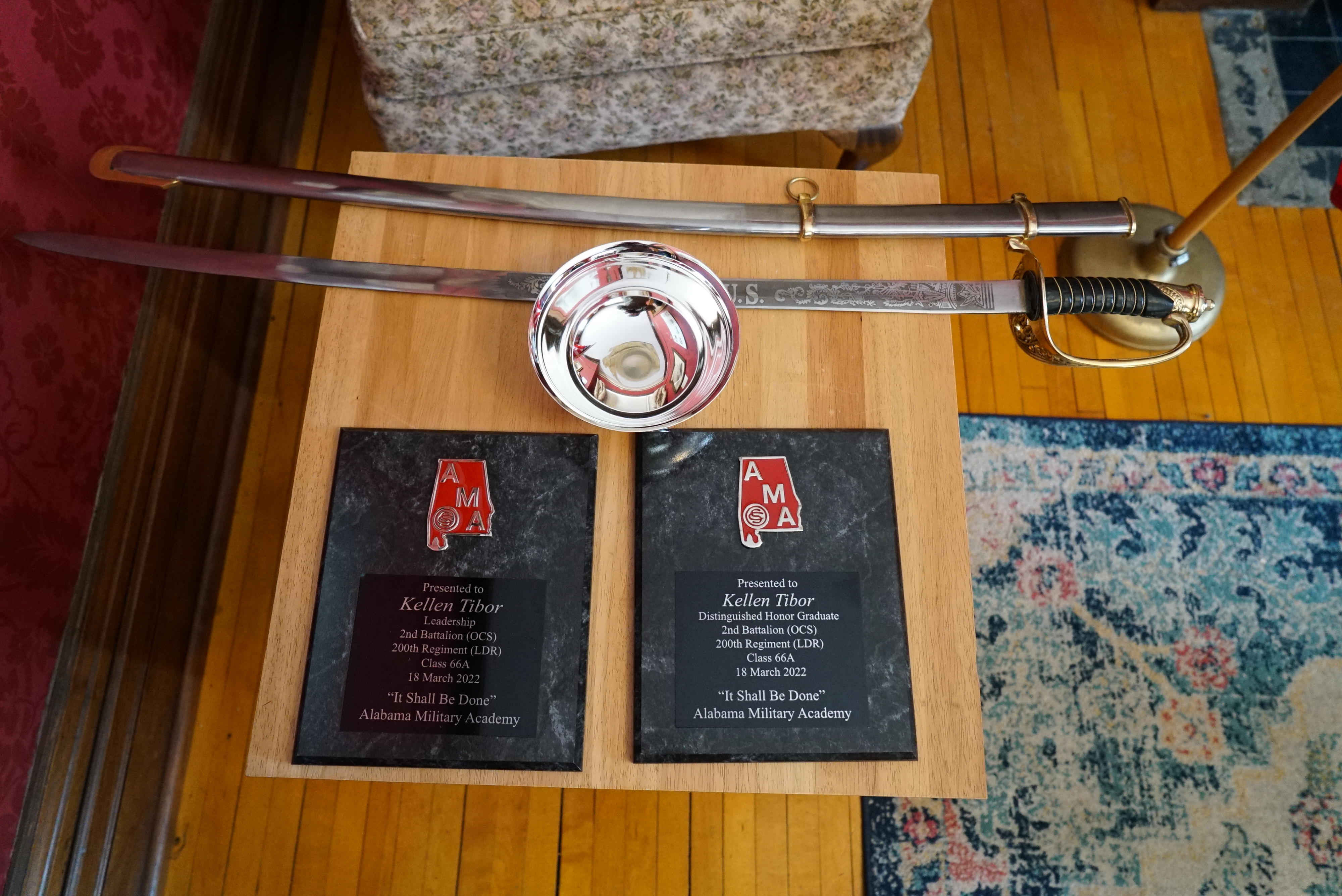 Later, while attending the fast track OCS program at Fort McClellan, Alabama, Tibor was recognized as the honor graduate of his class. This recognition goes to the officer candidate with the highest combined overall standing in leadership evaluations, academics, and peer evaluations. For this distinction, he earned the Erickson Trophy.