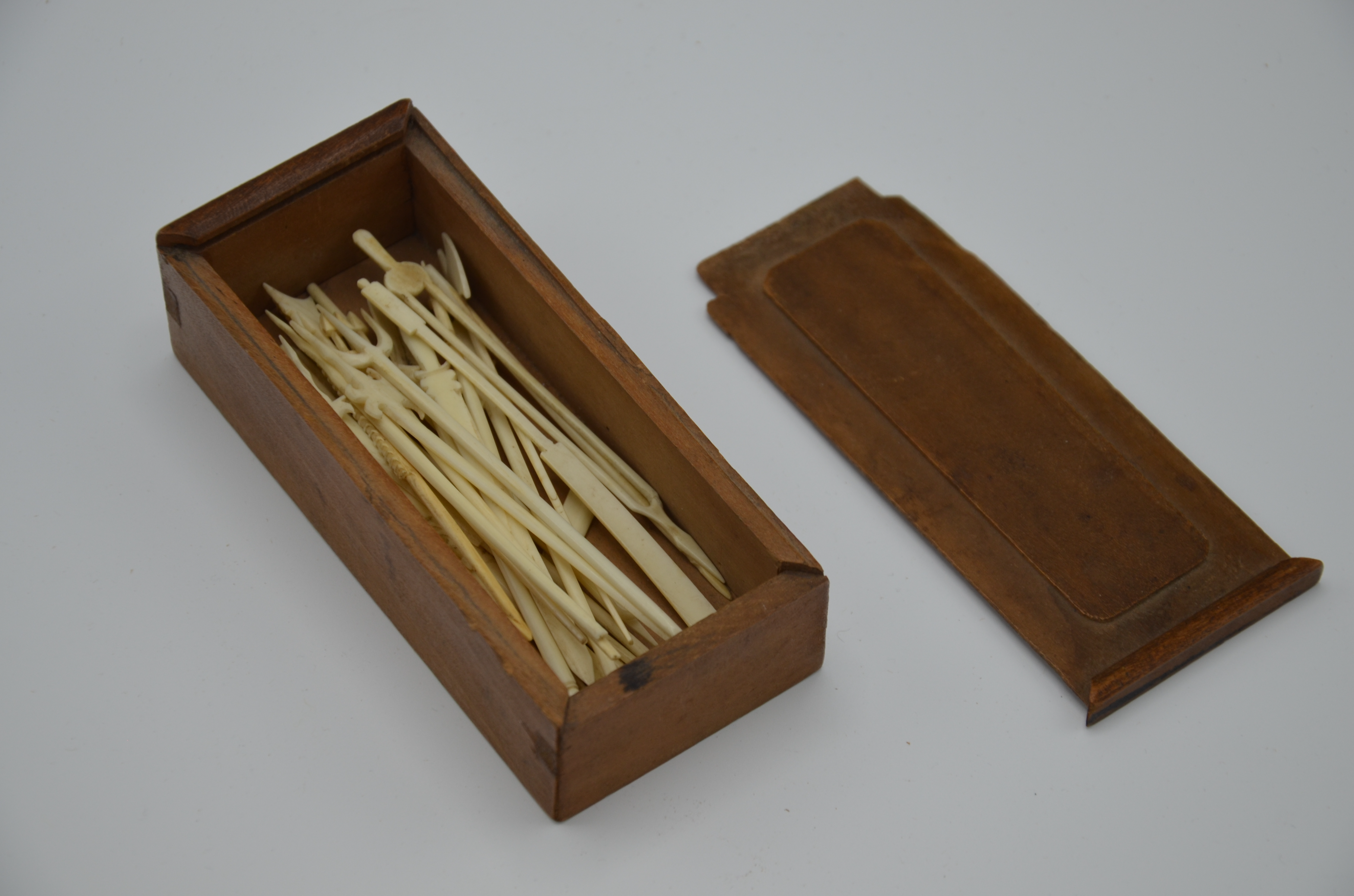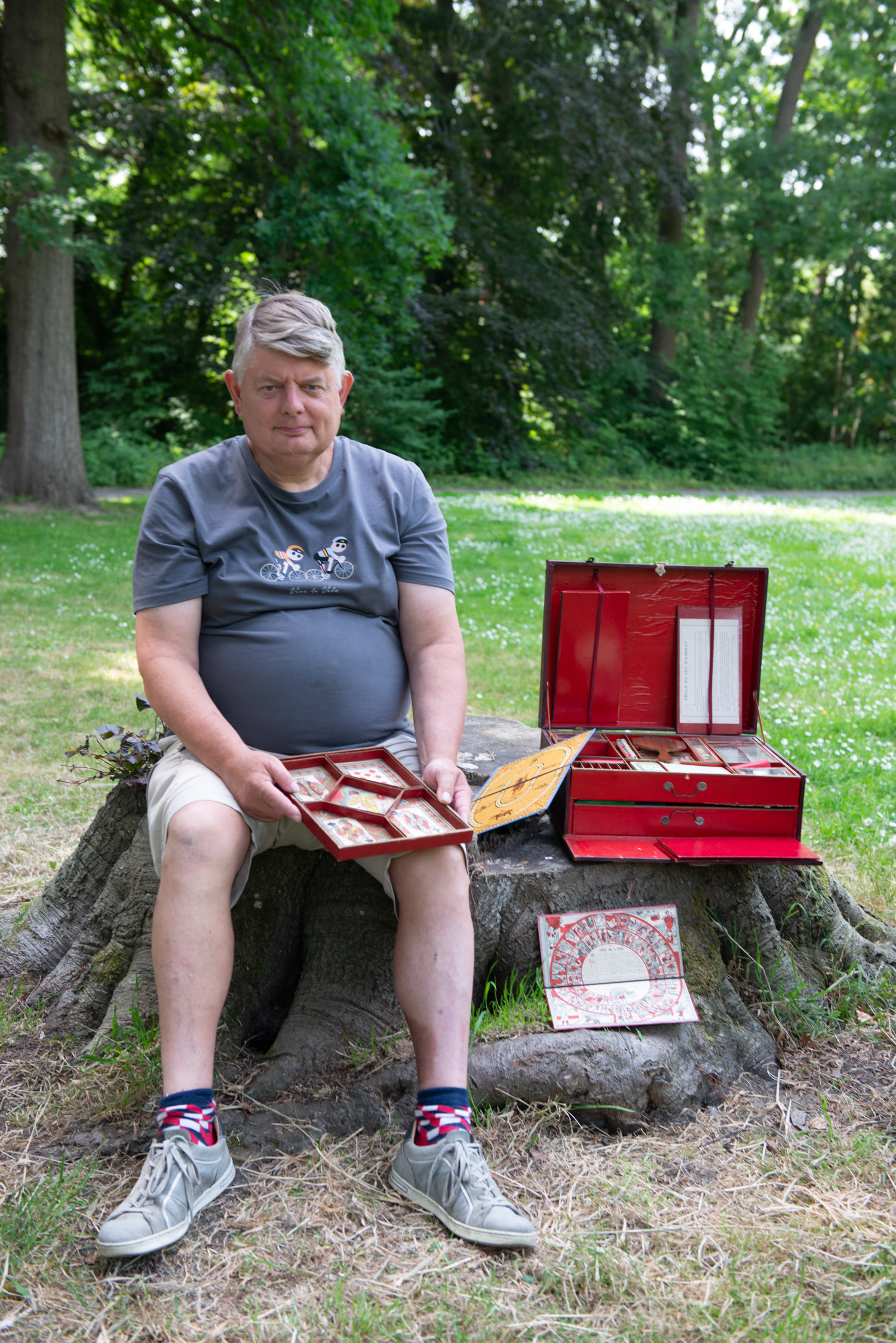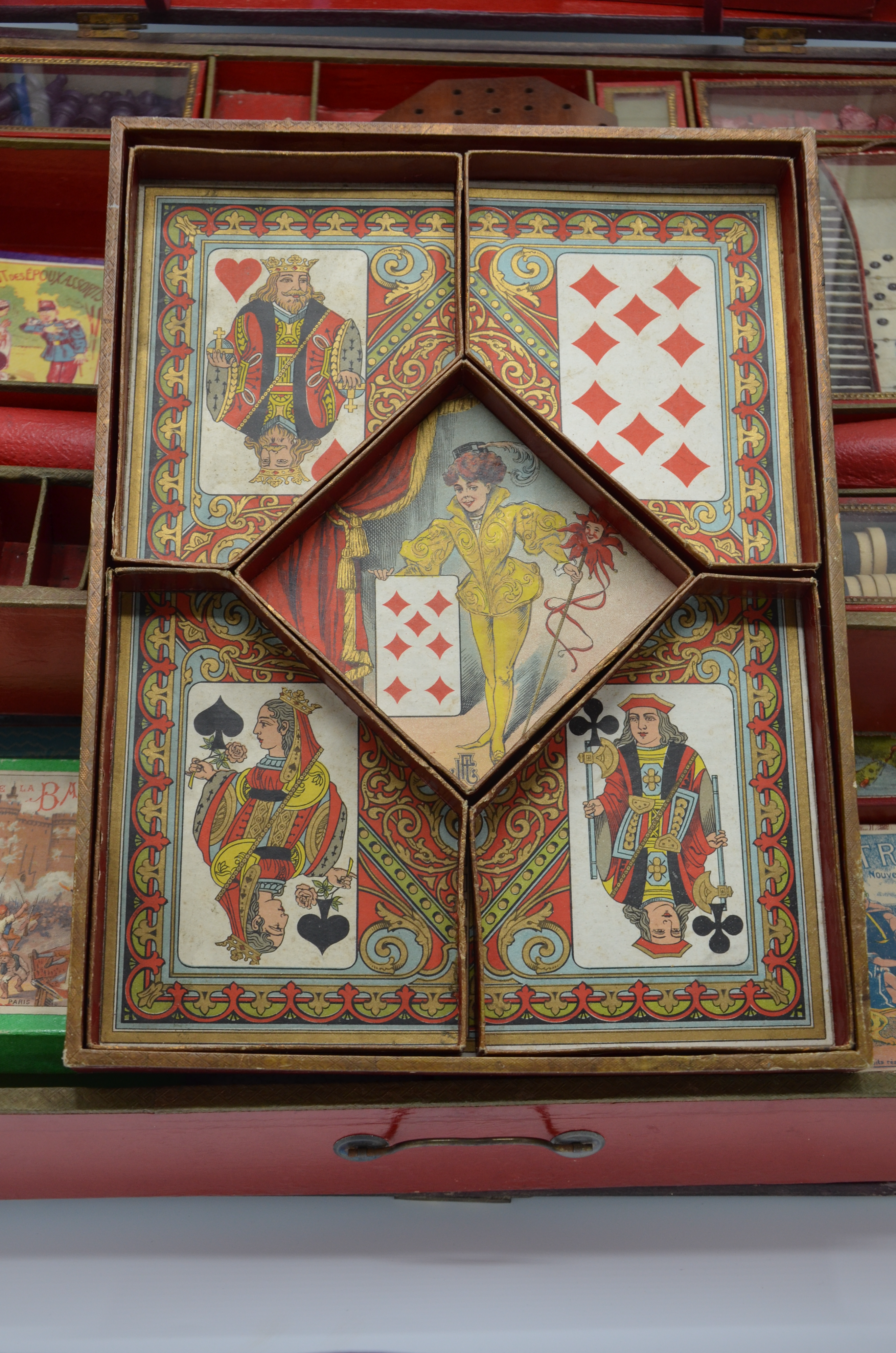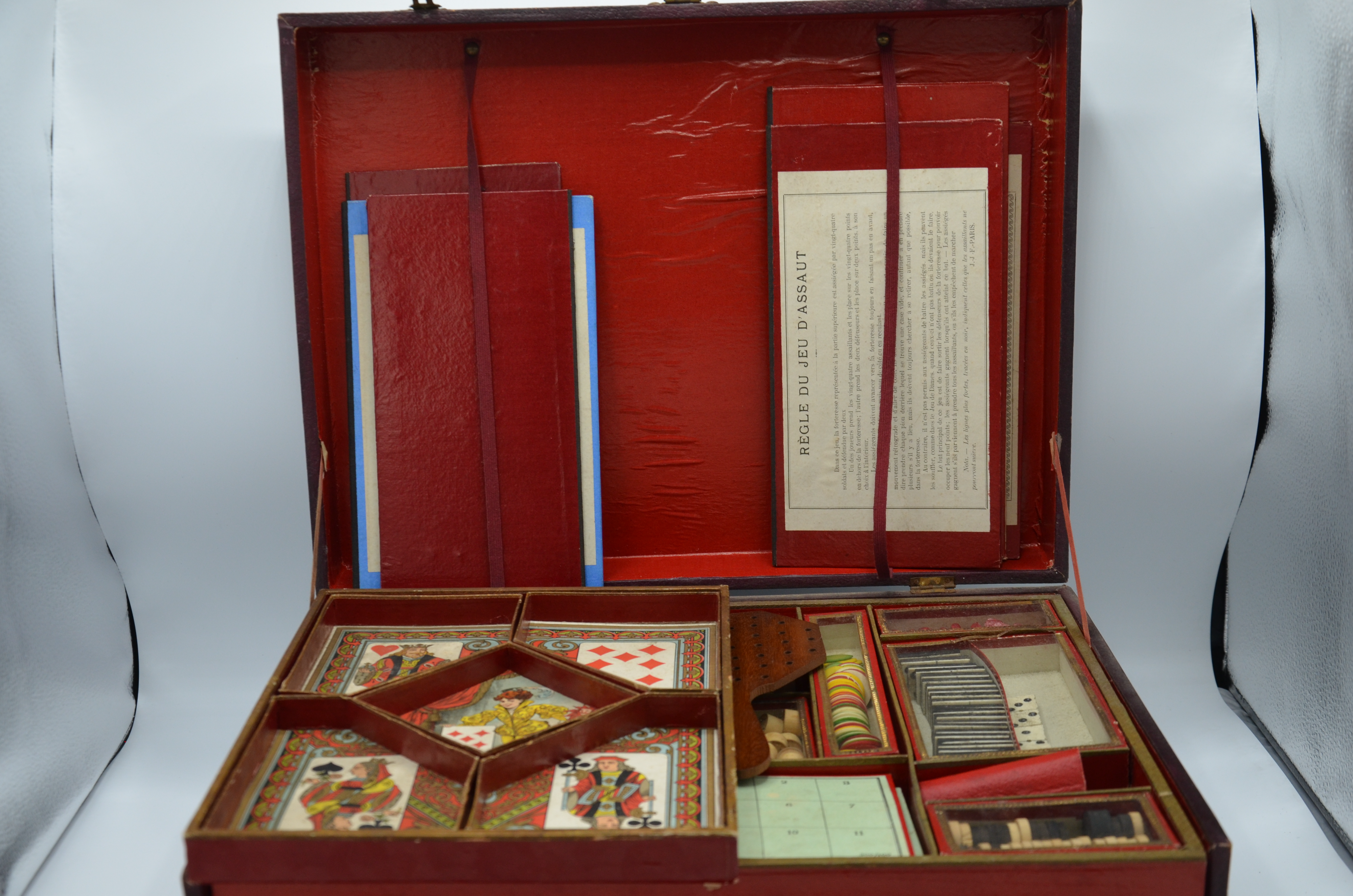 Peter bracht een prachtige spelkoffer uit de 19e eeuw mee. Het is een 'Jeux Réunis', een verzameling van allemaal kleine spelletjes. Het VIVES Spellenlab heeft in zijn collectie ook zo'n verzameldozen, maar niet van deze kwaliteit. Wat een pareltje!