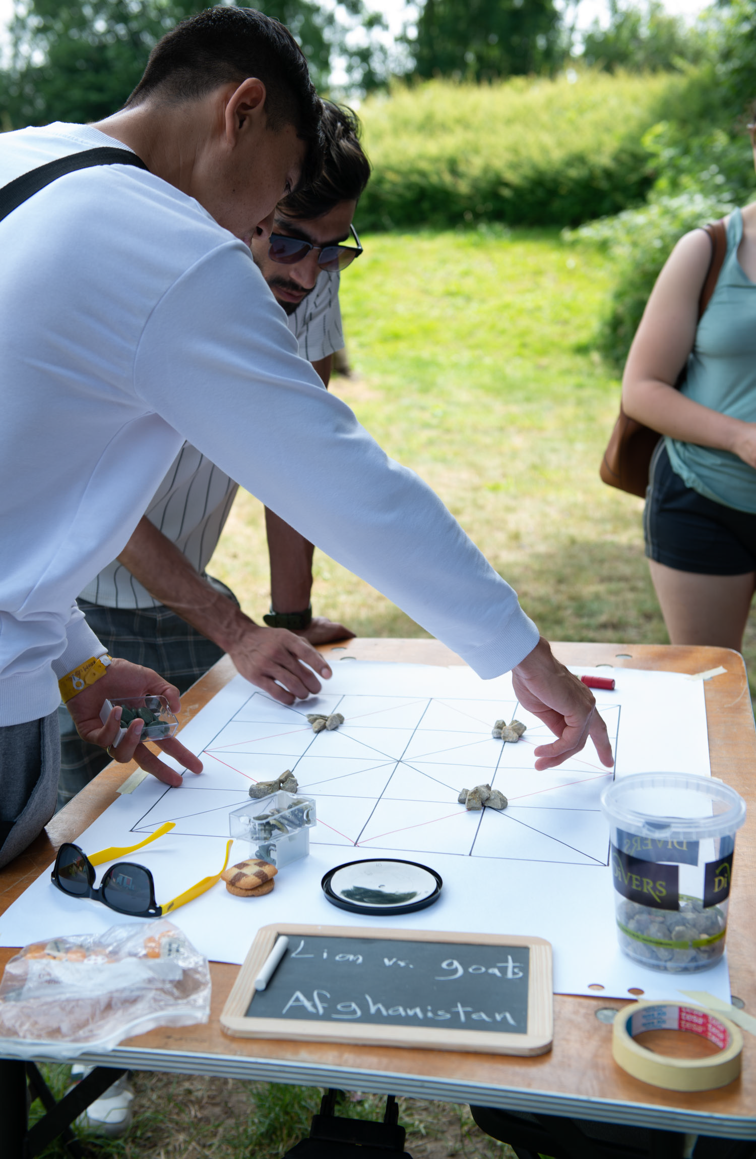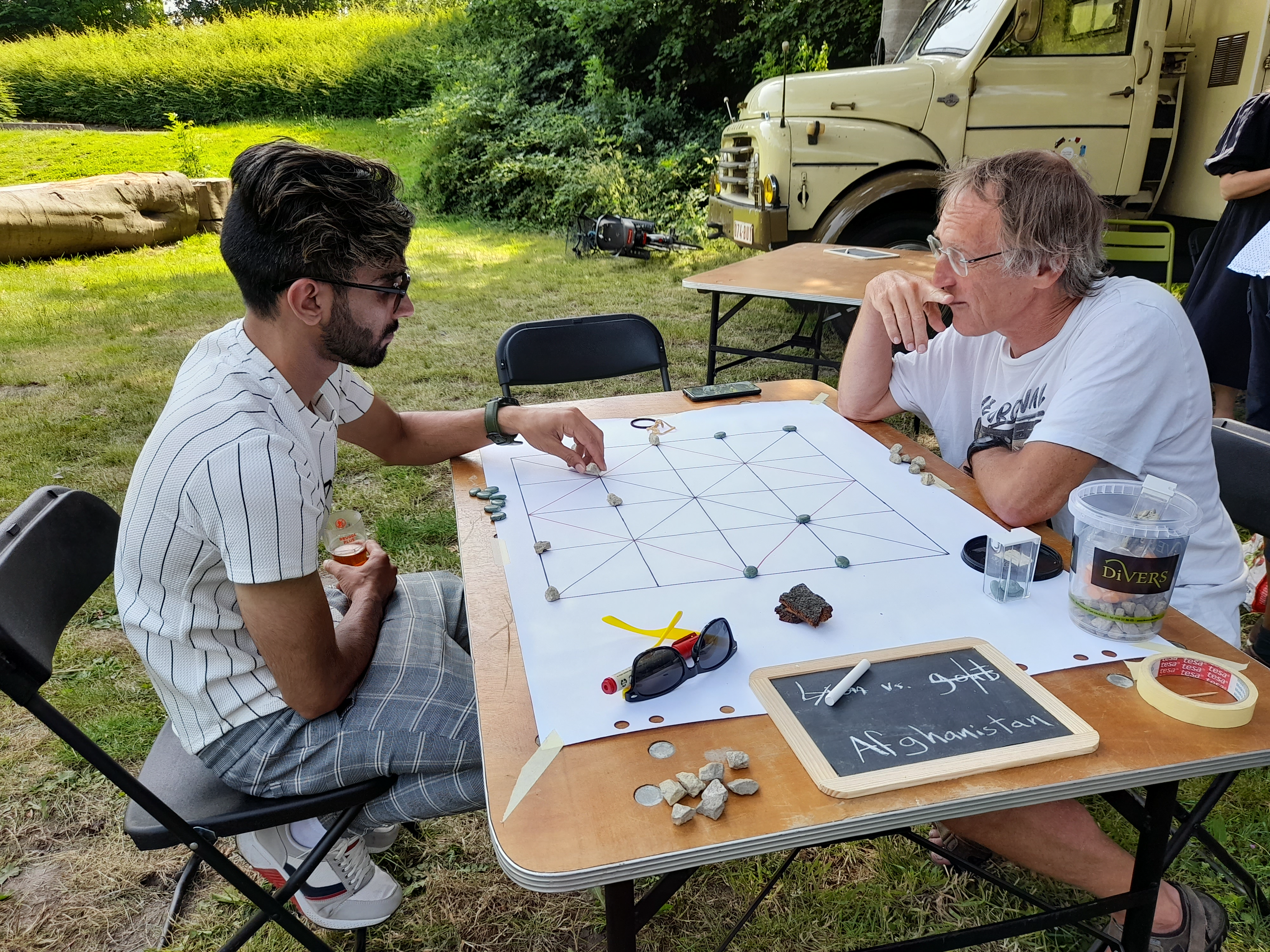 Ali bracht het spel 'Leeuwen en geiten' uit Afghanistan mee. In Nepal staat dit spel gekend als 'Tijgers en geiten' (Bagh Chal). Het is een denkspel waarbij je tactisch moet spelen om je tegenstander in de val te lokken. Je hebt praktisch niets nodig om het spel te spelen: enkele lijnen en pionnen (dit kunnen steentjes en stokjes zijn). Het spel lokte de hele middag nieuwsgierigen, de speltafel is niet één moment onbezet geweest. Ali is vrijwilliger bij FMDO vzw en werkte vanaf de eerste brainstorm mee aan de uitwerking van onze collectiedag.