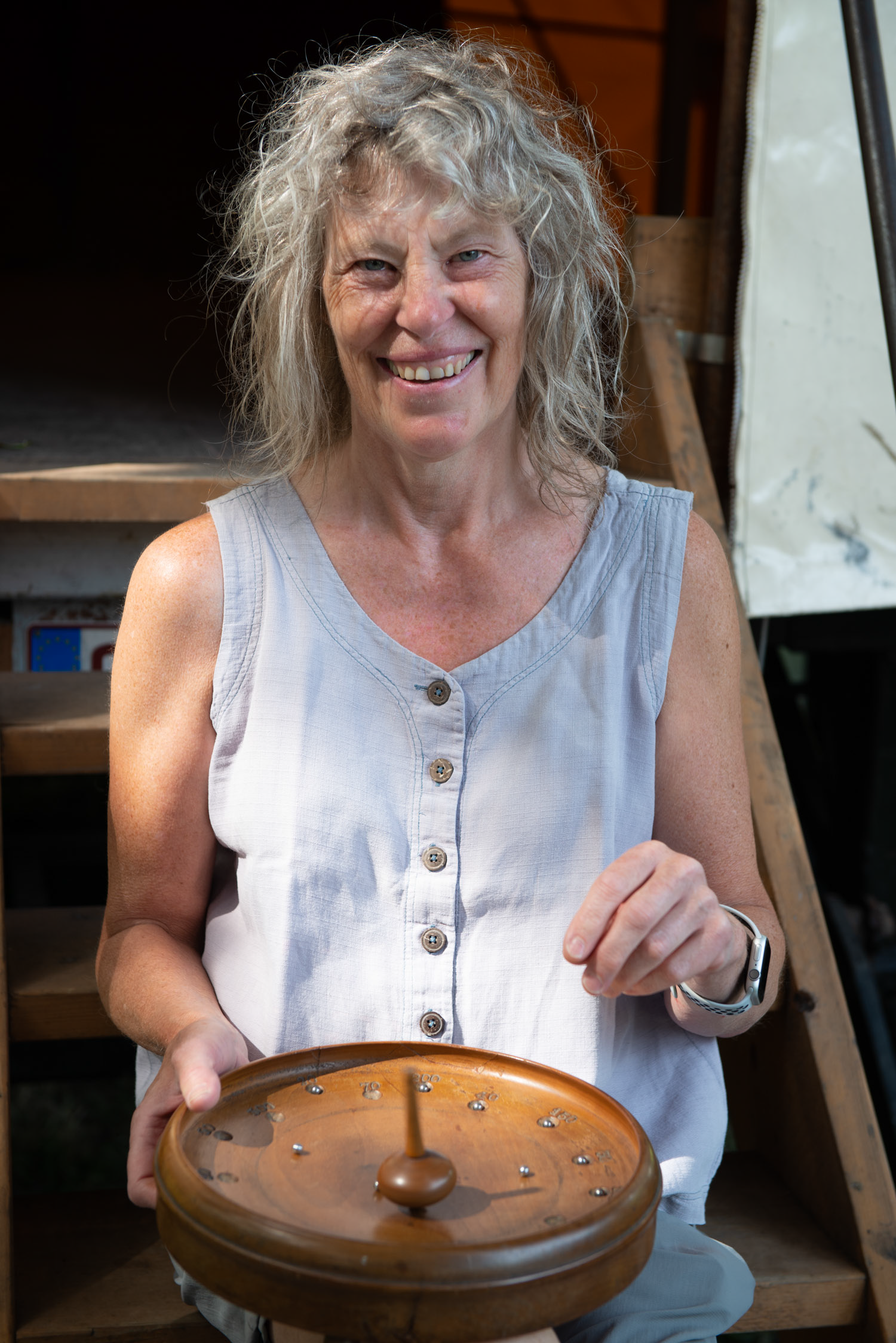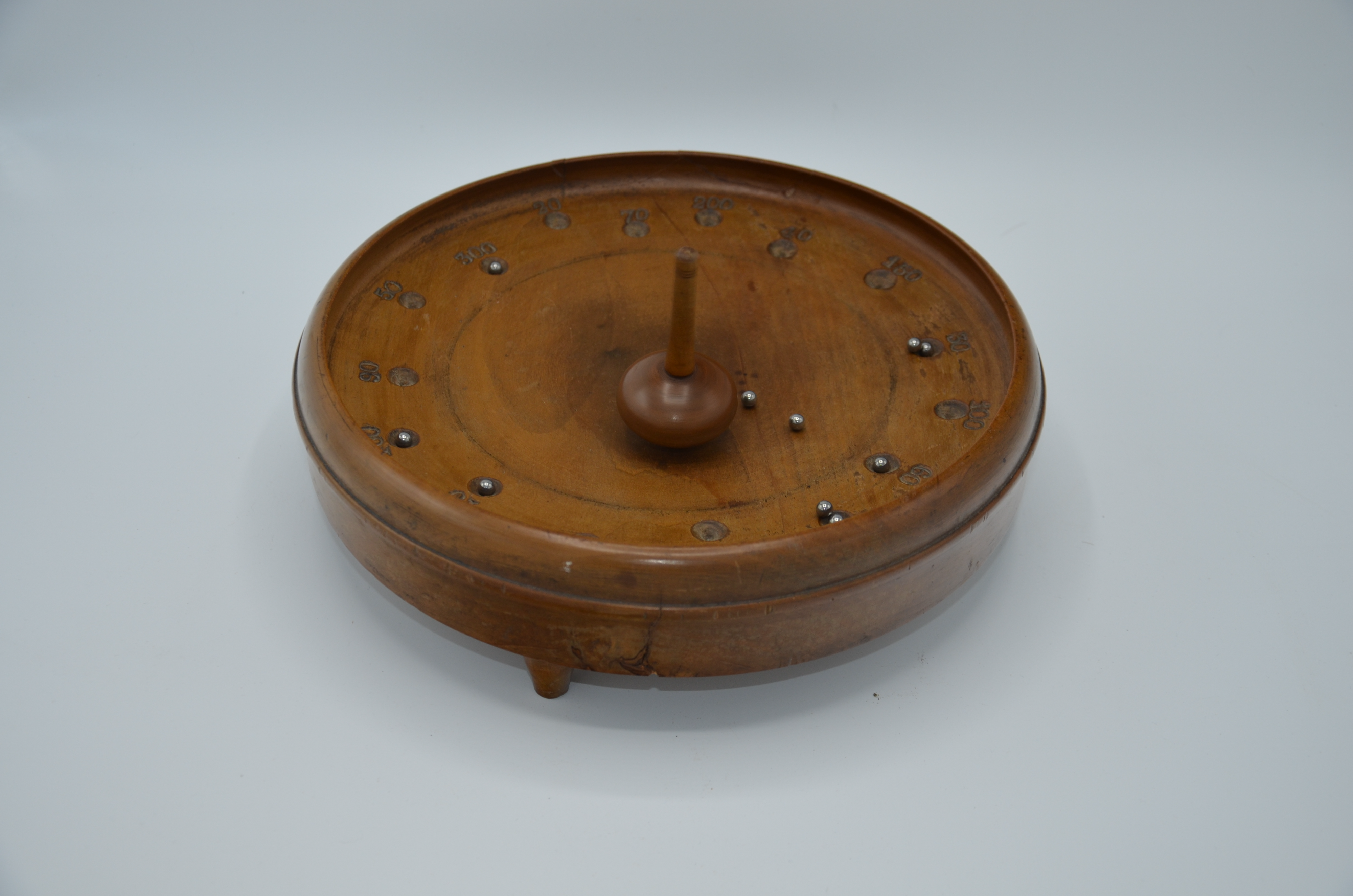 Myriam is een grote Uitwijkenfan, ook dit jaar was ze van de partij en bracht een spel mee dat al jaren op haar kast staat. Het is niet alleen een mooi voorwerp, het blijkt ook een erg toegankelijk spel. Een blinde man leerde haar het spel kennen. Bert Vertommen van Volksspelen Madeleine herkende meteen het 'dopspel', een oud caféspel waarvan de vroegste bronnen dateren uit de jaren 1910. Wellicht is het spel nog ouder. Er zijn verschillende namen voor het spel: Girolette, Virolon, Tyrolienne of (in het Nederlands) Dopspel. Elk bord heeft een andere eigen scoreverdeling. De tol en de 10 loden balletjes van dit specifieke exemplaar werden wellicht later toegevoegd. Ze dateren duidelijk van een andere periode.
