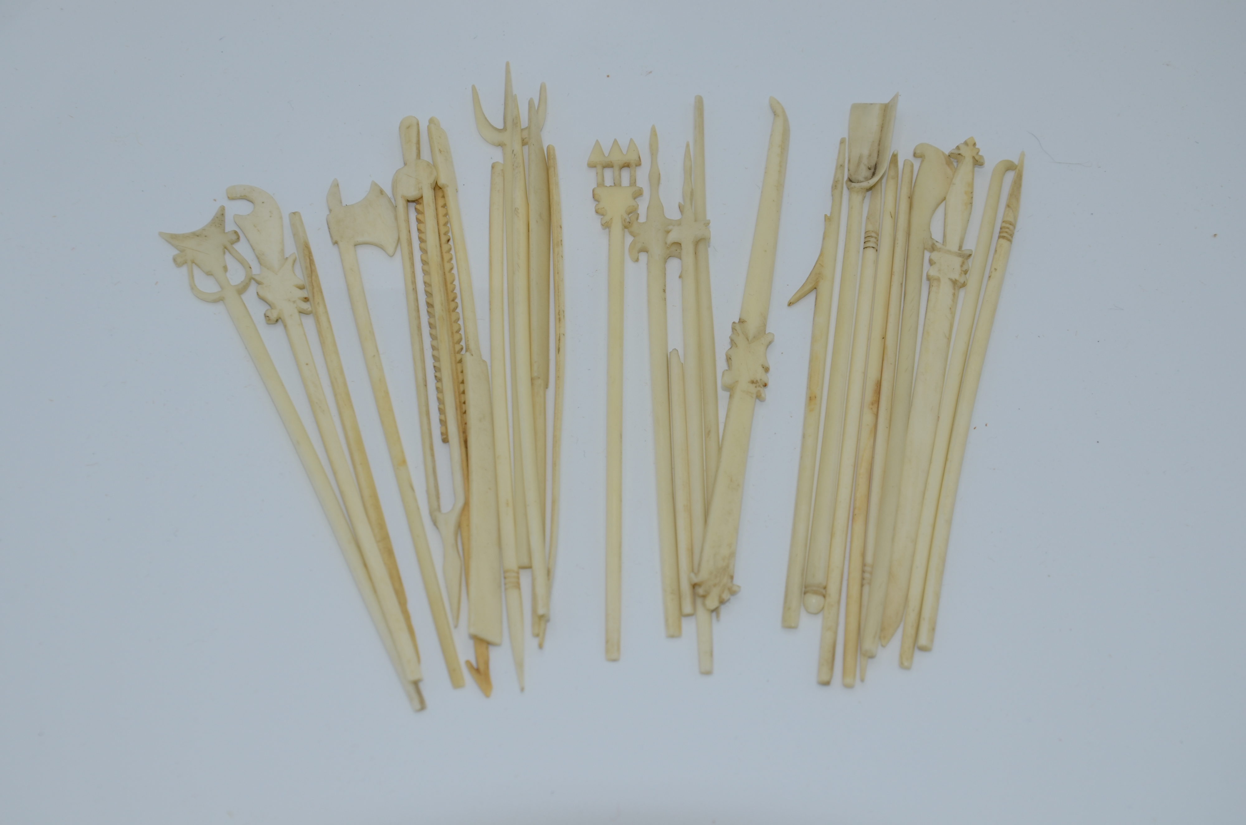 Tot het midden van de 20ste eeuw was deze uitvoering van Mikado courant: korte witte staafjes die qua vorm varieerden. Het spel is oorspronkelijk afkomstig uit China.