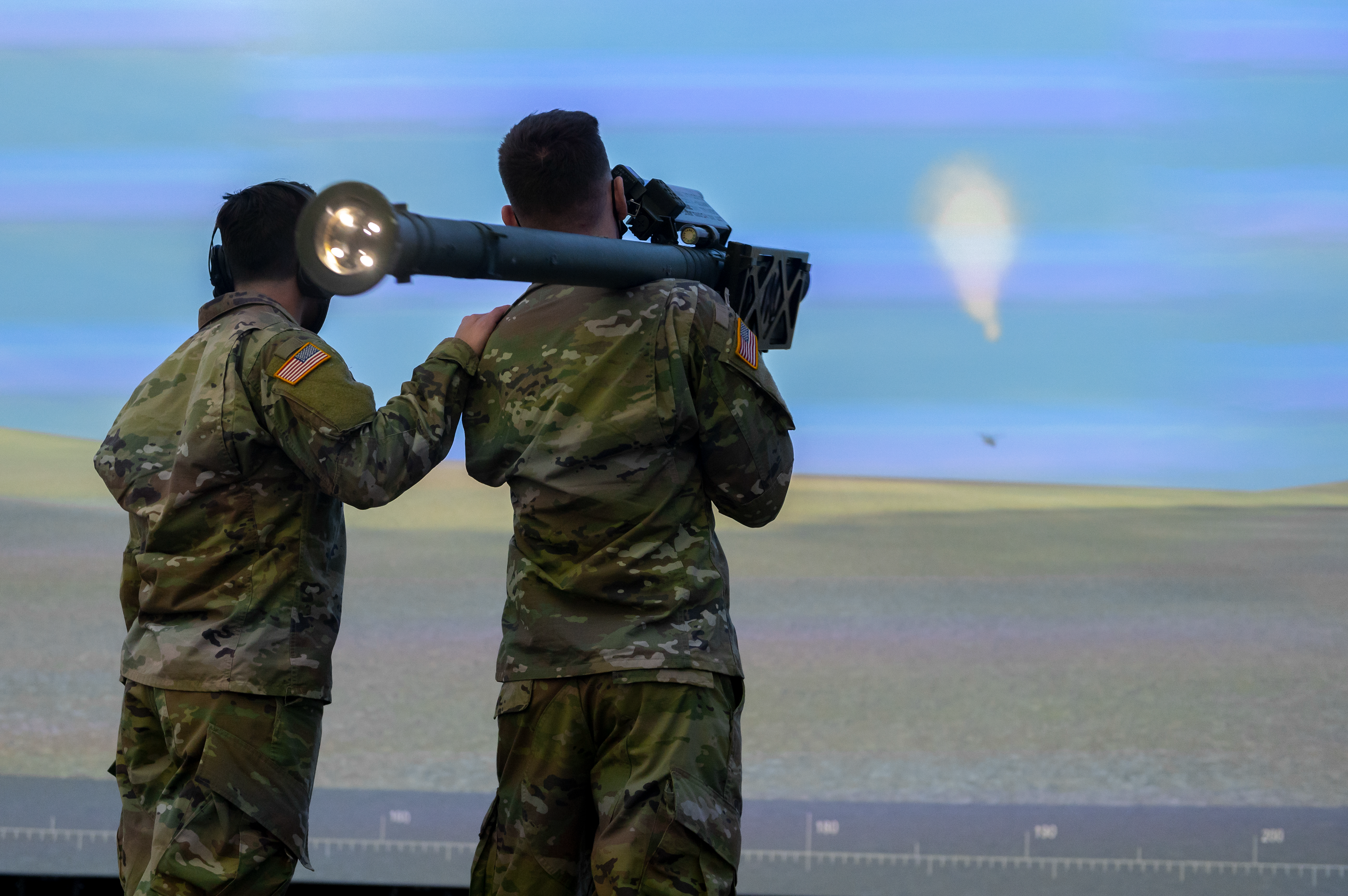 Photo: Pfc. Matthew Tornow, left, and Staff Sgt. Garret Engelke, 1-188th Air Defense Artillery, search for targets in the Improved Move Target Simulator, during their training and evaluation, Grand Forks, N.D., March 27, 2021.