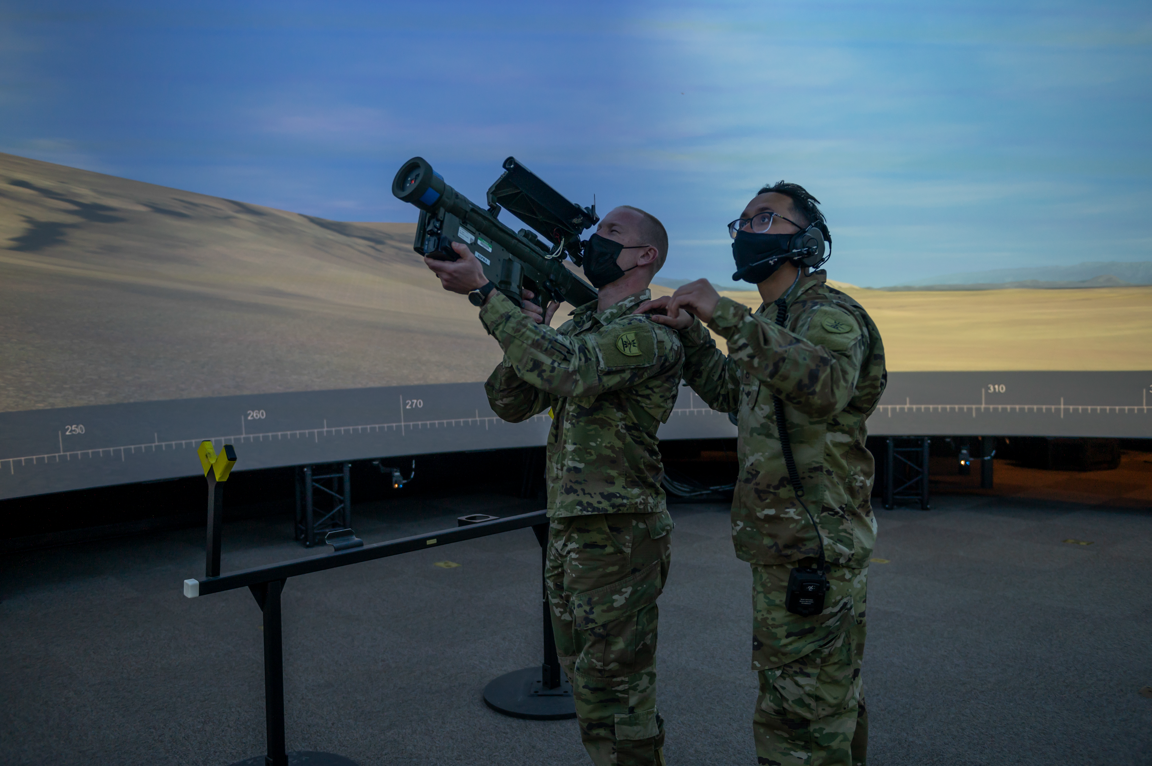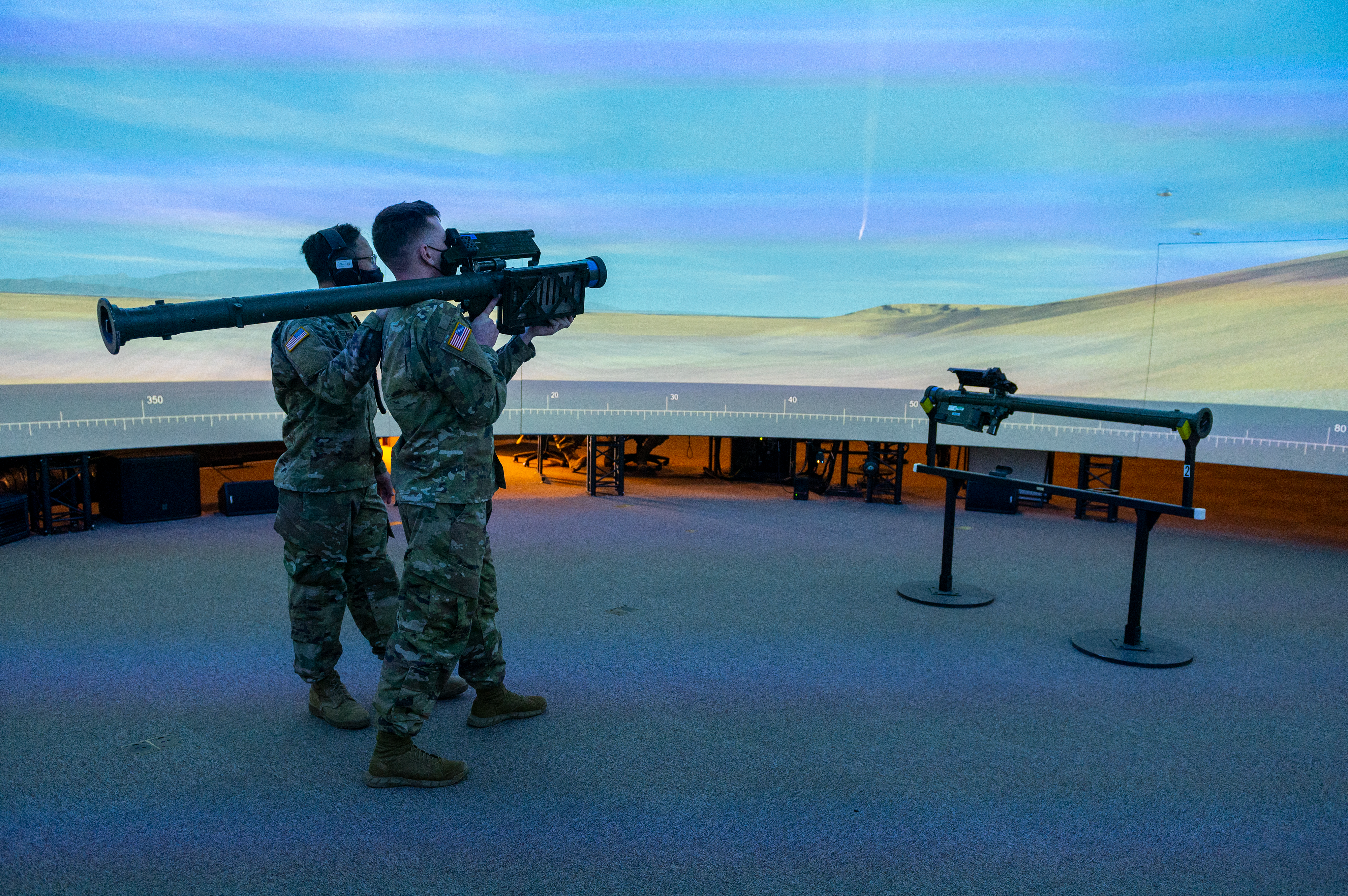 There are only two such Stinger training systems in the U.S. Army; one at Fort Sill, Okla., the home of U.S. Army Air Defense Artillery, and this one in Grand Forks. The IMTS uses the latest technology to train Stinger teams using the techniques and skills required for in employing the Stinger Man Portable Air Defense System (MANPADS). The system can train two Stinger teams simultaneously and is used to identify, acquire and track airborne targets and launch missiles to defeat enemy air threats. The IMTS was upgraded January 2021, improving its immersive training capabilities. Inside the Stinger Dome, Soldiers use a training Stinger and search inside the 360-degree virtual reality dome for aerial targets, similar to a video game.