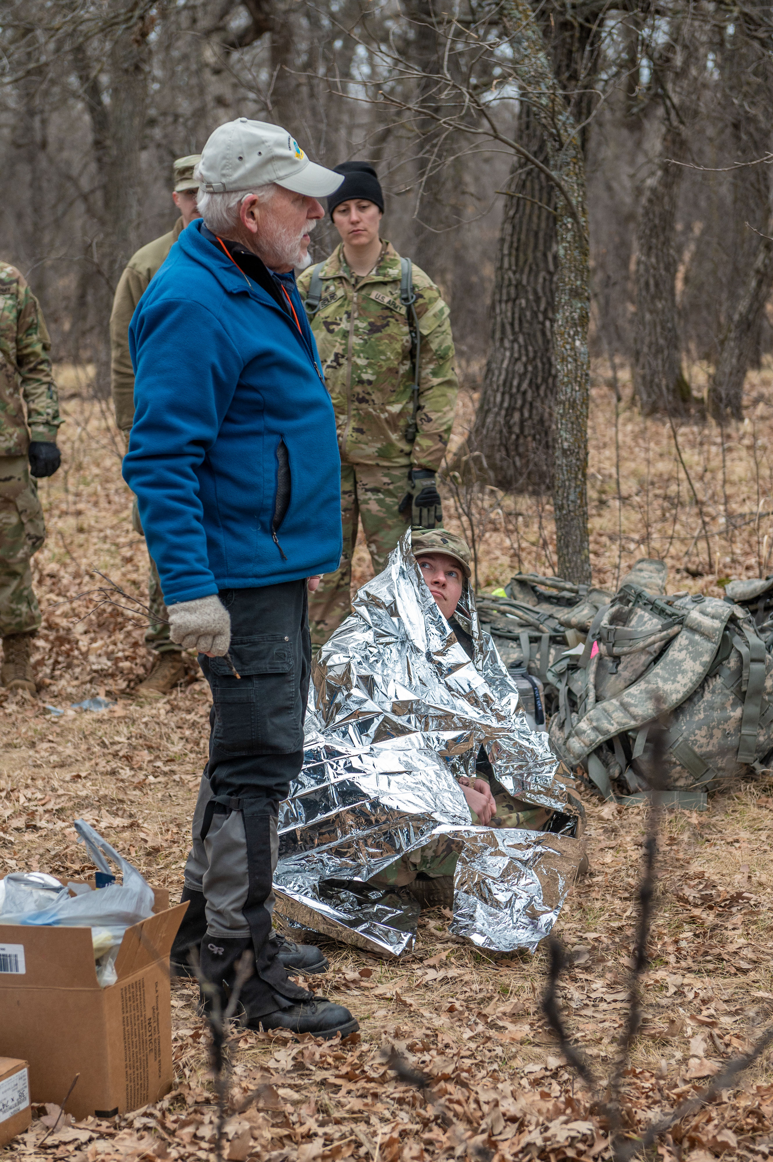 Robert “Skip” Stoffel, left, an instructor with Emergency Response International, explains the pros and cons of using a space blanket in a survival situation to Soldiers of the 1st Battalion, 112th Aviation Regiment, during their field survival training exercise at Camp Grafton, March 26, 2021. While beneficial in some medical situations, the blanket is not very useful in survival situations.