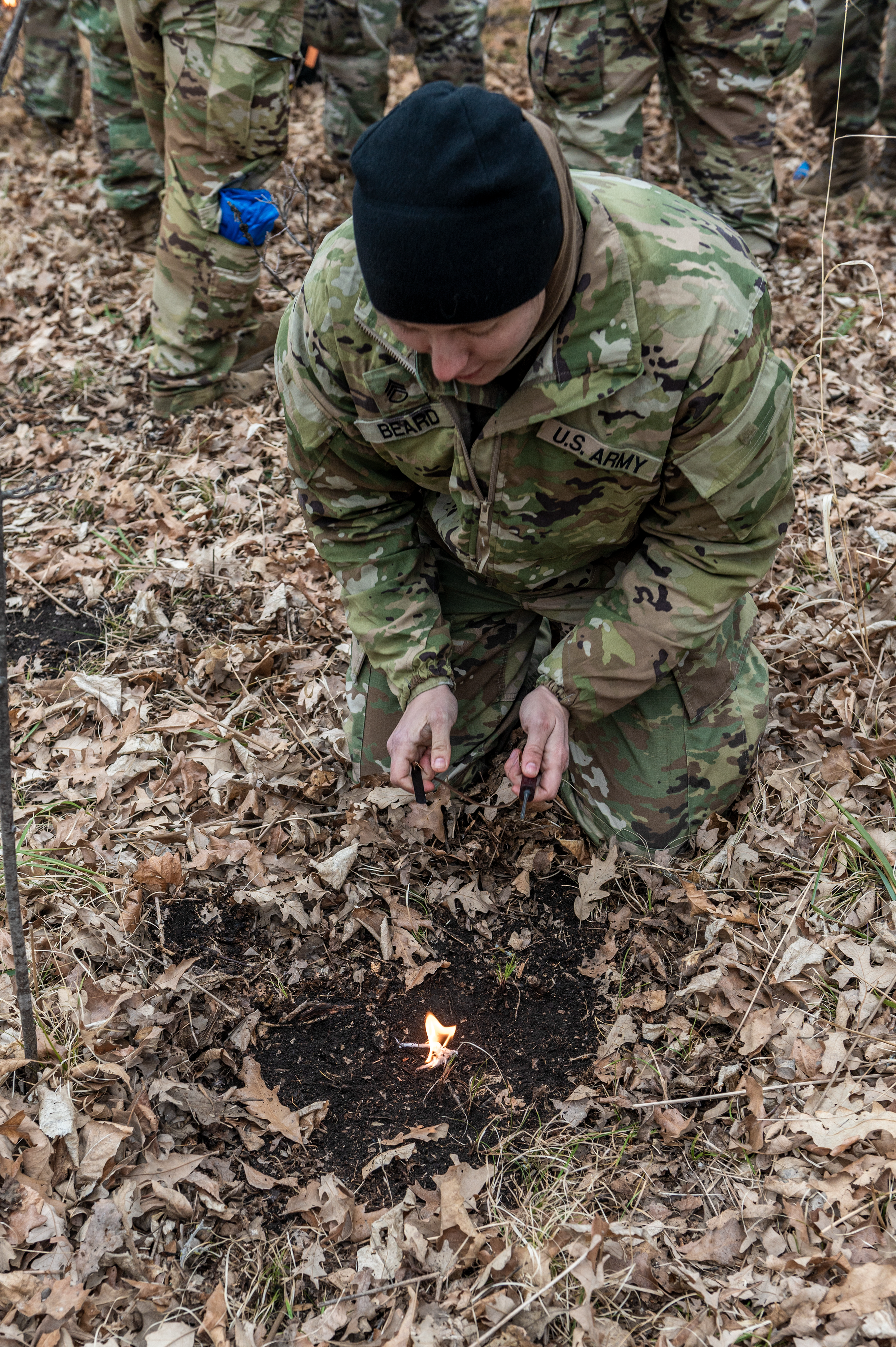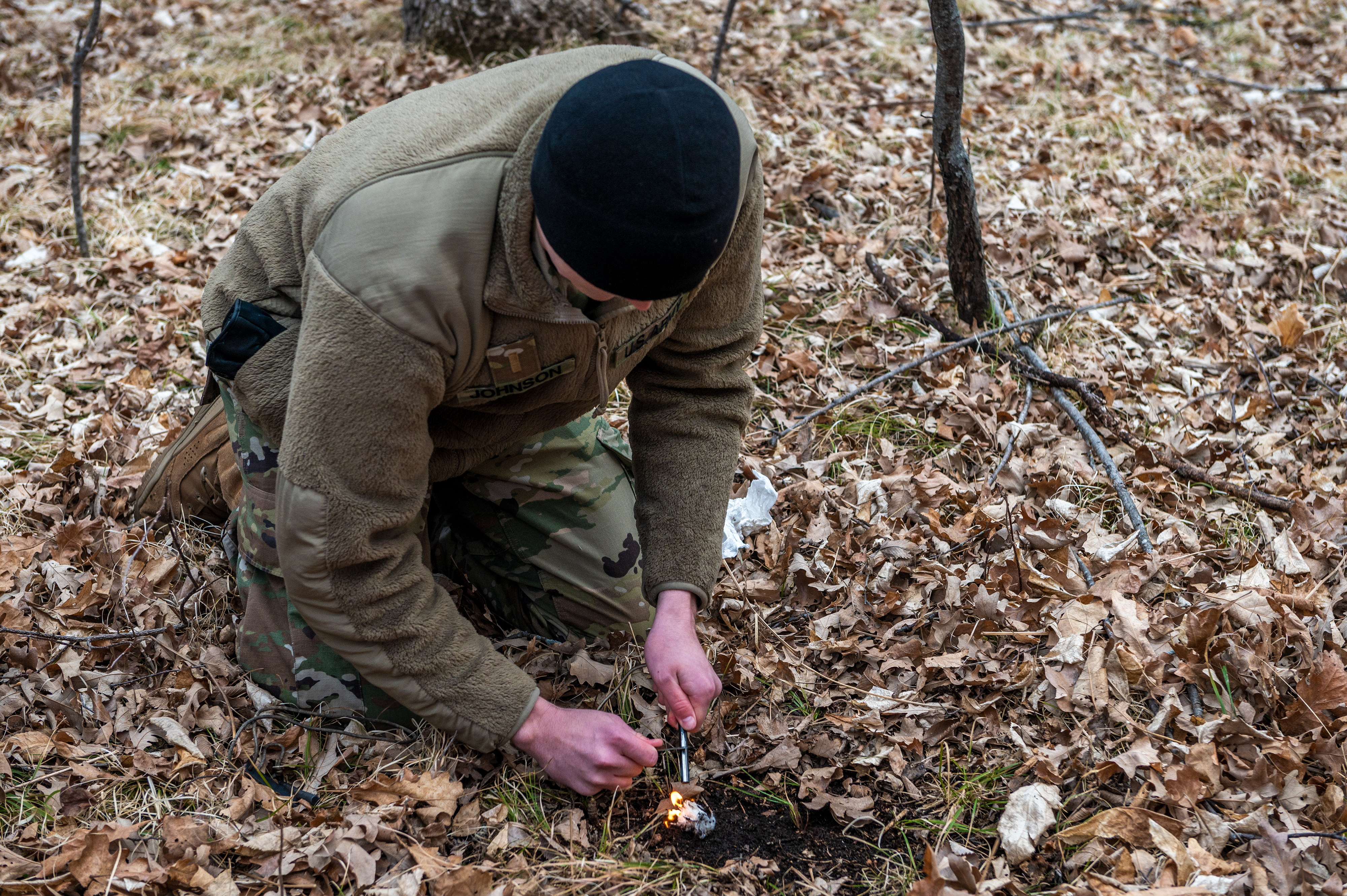 2nd Lt. Micah Johnson, 1st Battalion, 112th Aviation Regiment, starts a fire using a cotton-ball saturated with Vaseline as tinder, during a field survival training exercise at Camp Grafton Training Center, March 26, 2021.