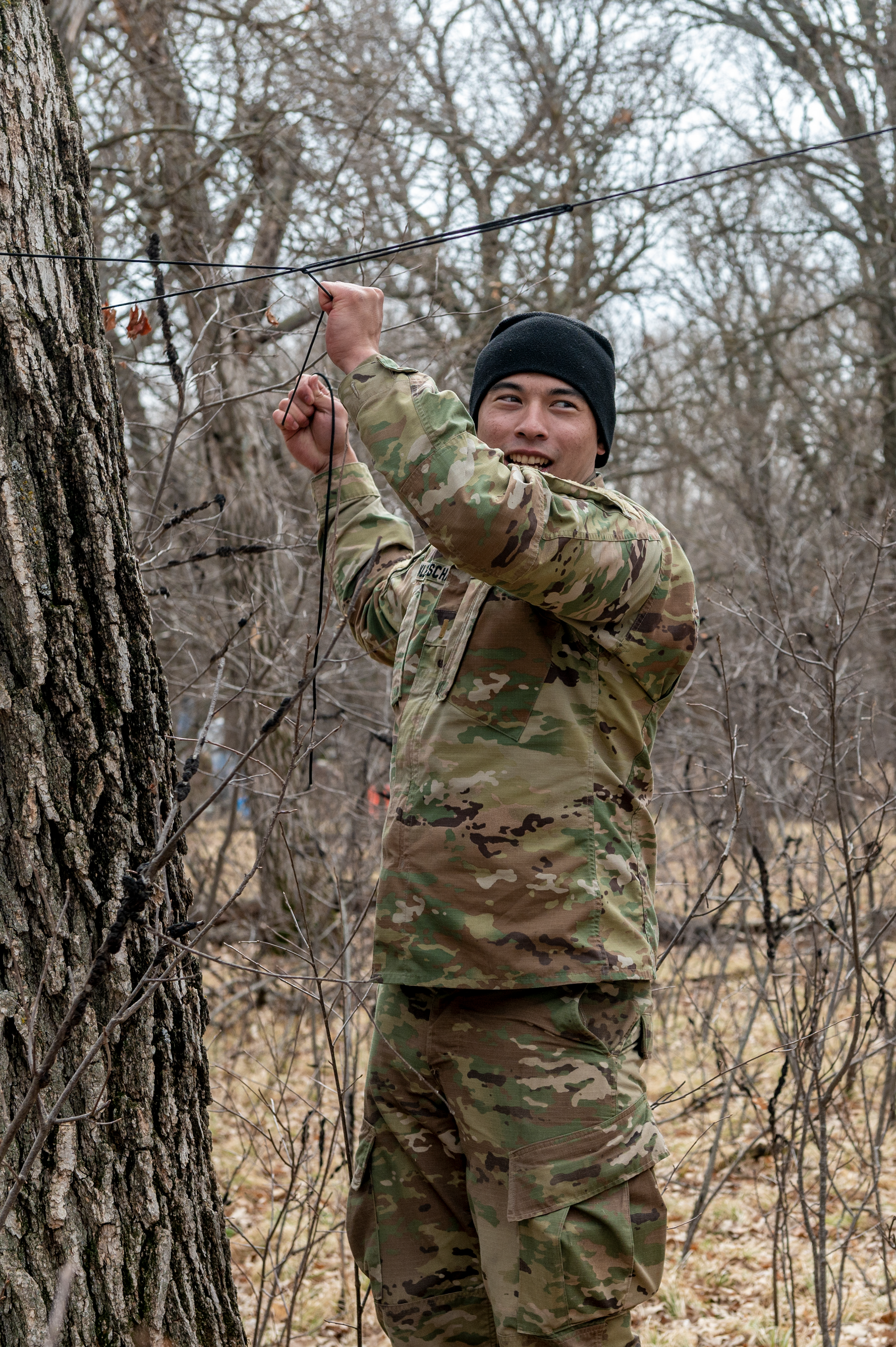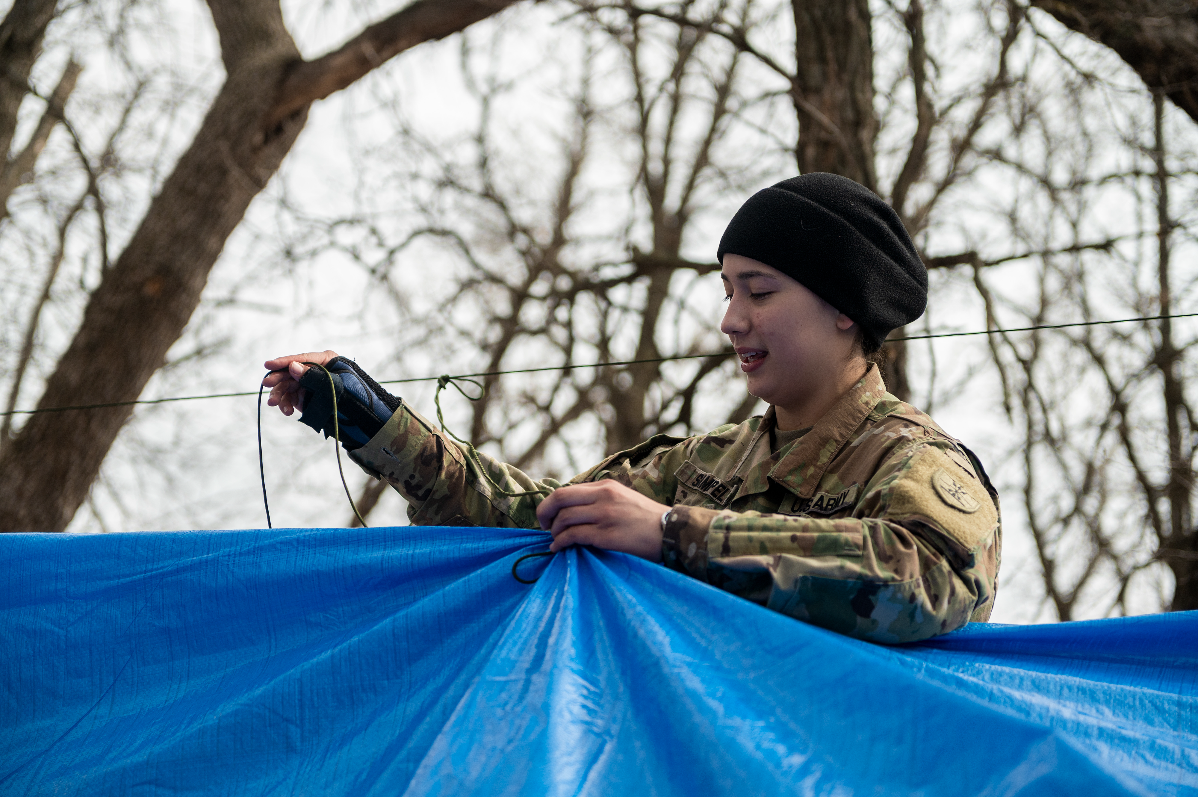 Cadet Hanna Sampel, 1st Battalion, 112th Aviation Regiment, prepares her overnight shelter with paracord during a field survival training exercise at Camp Grafton Training Center, March 26, 2021.