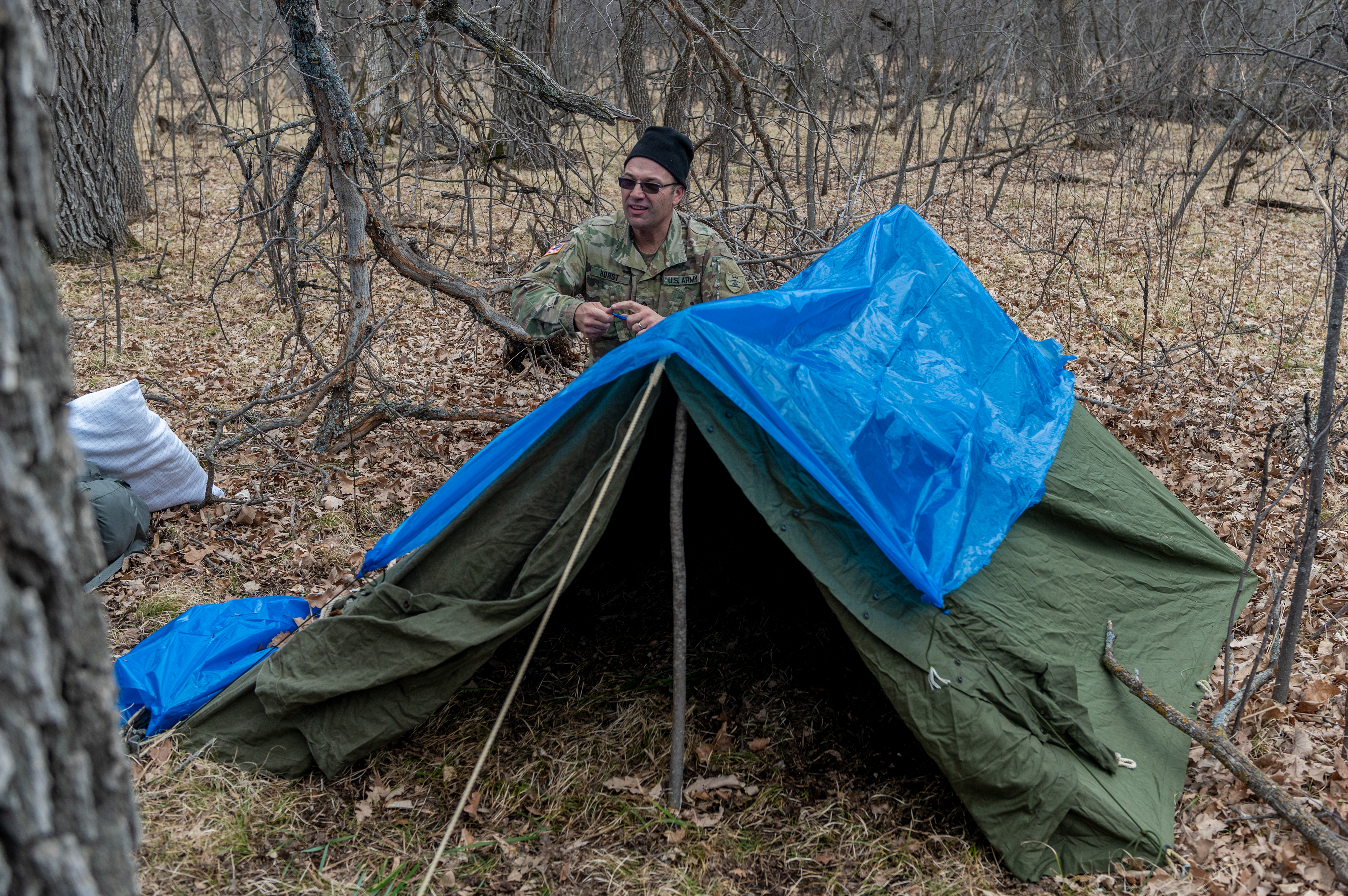 Sgt. 1st Class Scott Horst, 1st Battalion, 112th Aviation Regiment, builds his shelter in preparation for staying outside overnight during a field survival training exercise at Camp Grafton Training Center, March 26.