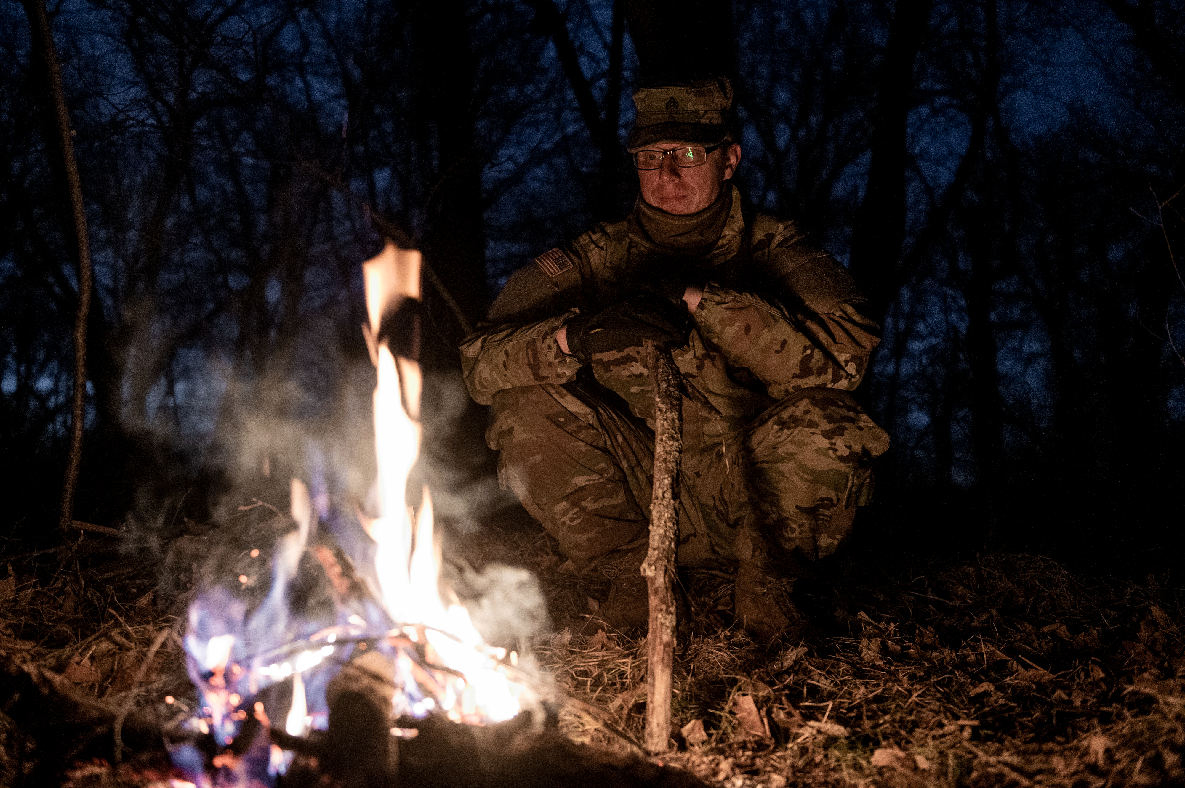 Sgt. Michael Hoffert, 1st Battalion, 112th Aviation Regiment, tends a fire during a field survival training exercise at Camp Grafton Training Center, March 26, 2021.
