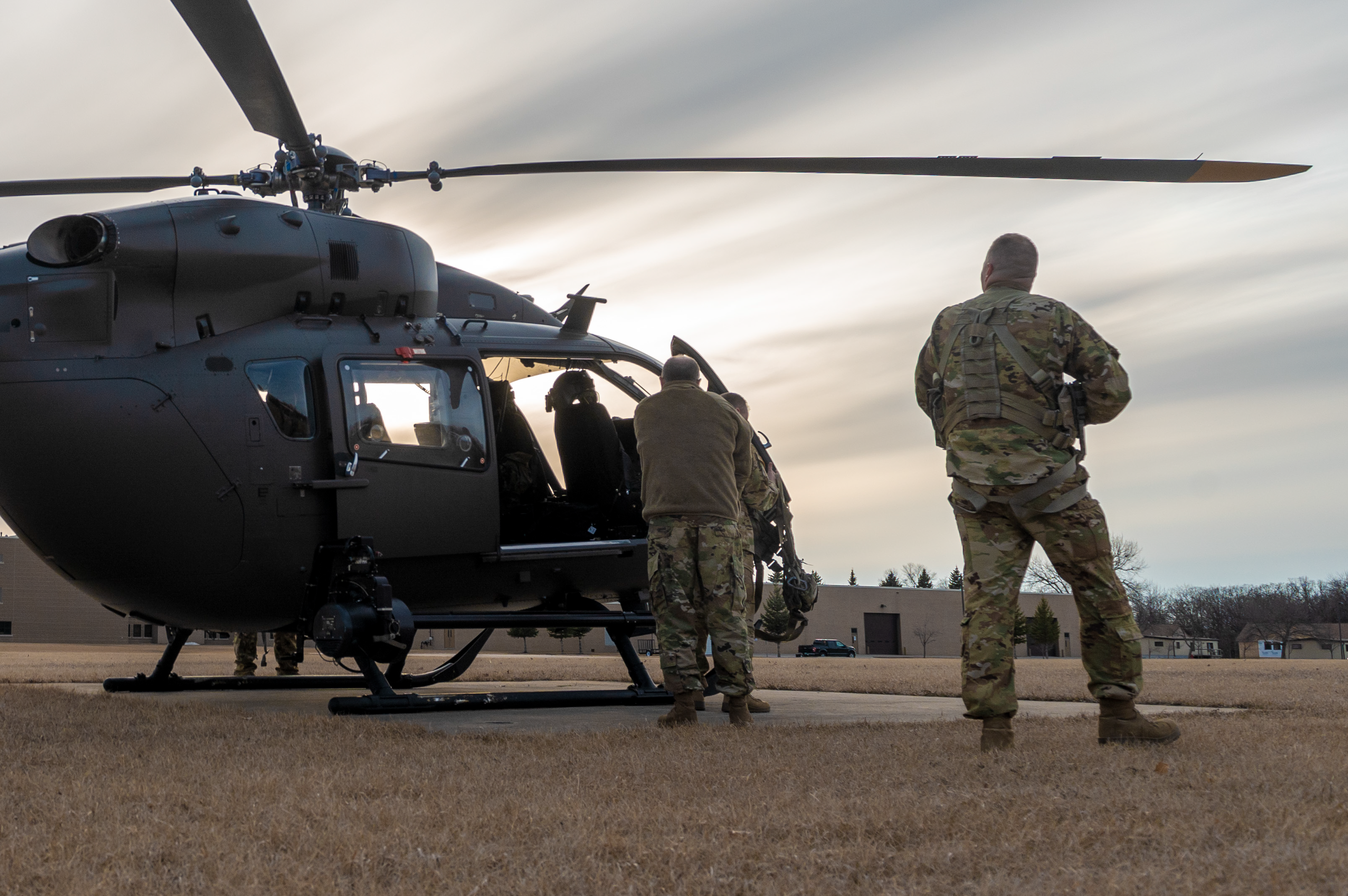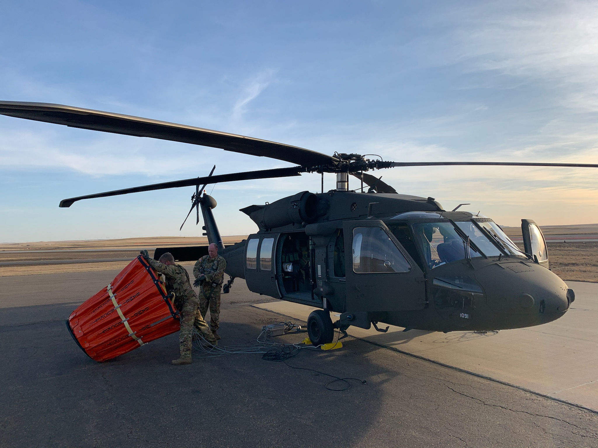 Top photo: One of two N.D. Black Hawk helicopters that deployed in response to wildfires near the town of Medora, N.D., sits on tarmac at the Dickinson Theodore Roosevelt Regional Airport, Dickinson, N.D. on April 1, 2021. The aircraft was refueling before assuming mission of aerial water delivery via the 600-gallon Bambi Bucket. Crew chiefs Staff Sgt. Andrew Iverson, right, and Sgt. Jared Reimer are preparing the bucket for the mission. (U.S. Army National Guard photo by Maj. Josh Yri, 1st Battalion, 112th Aviation Regiment)