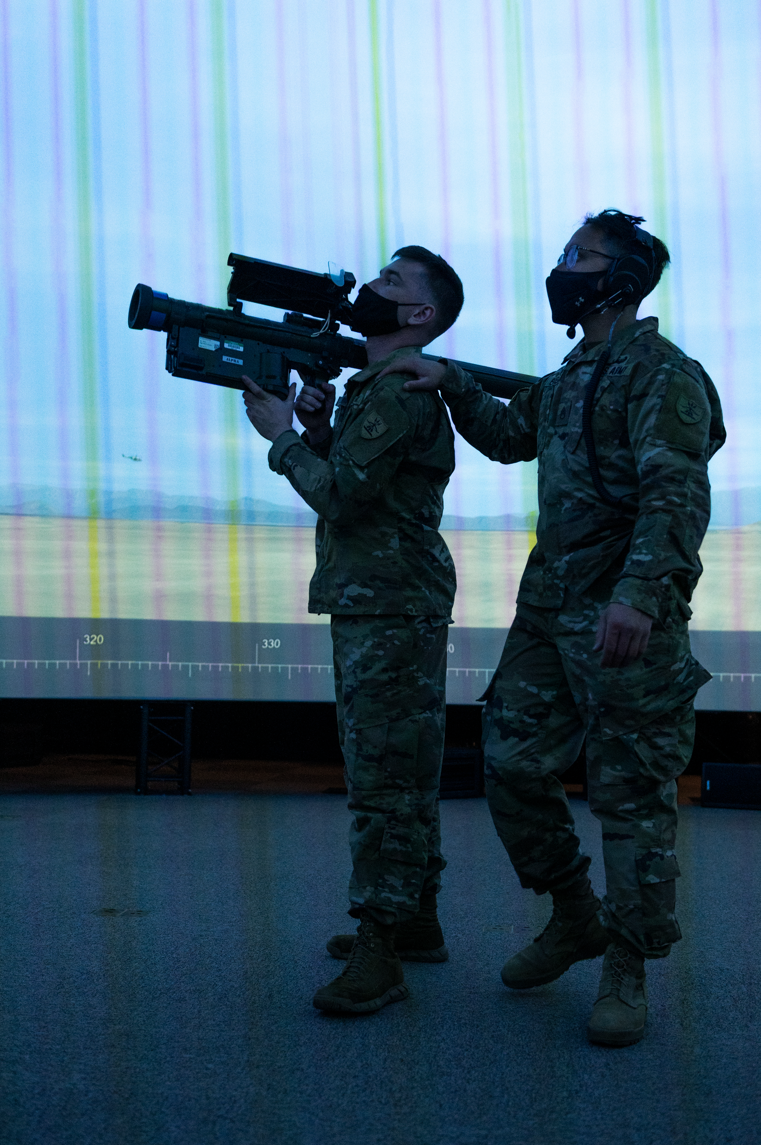 Pfc. Matthew Tornow, right, and Staff Sgt. Garret Engelke, 1st Battalion, 188th Air Defense Artillery Regiment, engage a moving target while training in the Improved Moving Target Simulator (IMTS), Grand Forks, N.D., March 27, 2021.