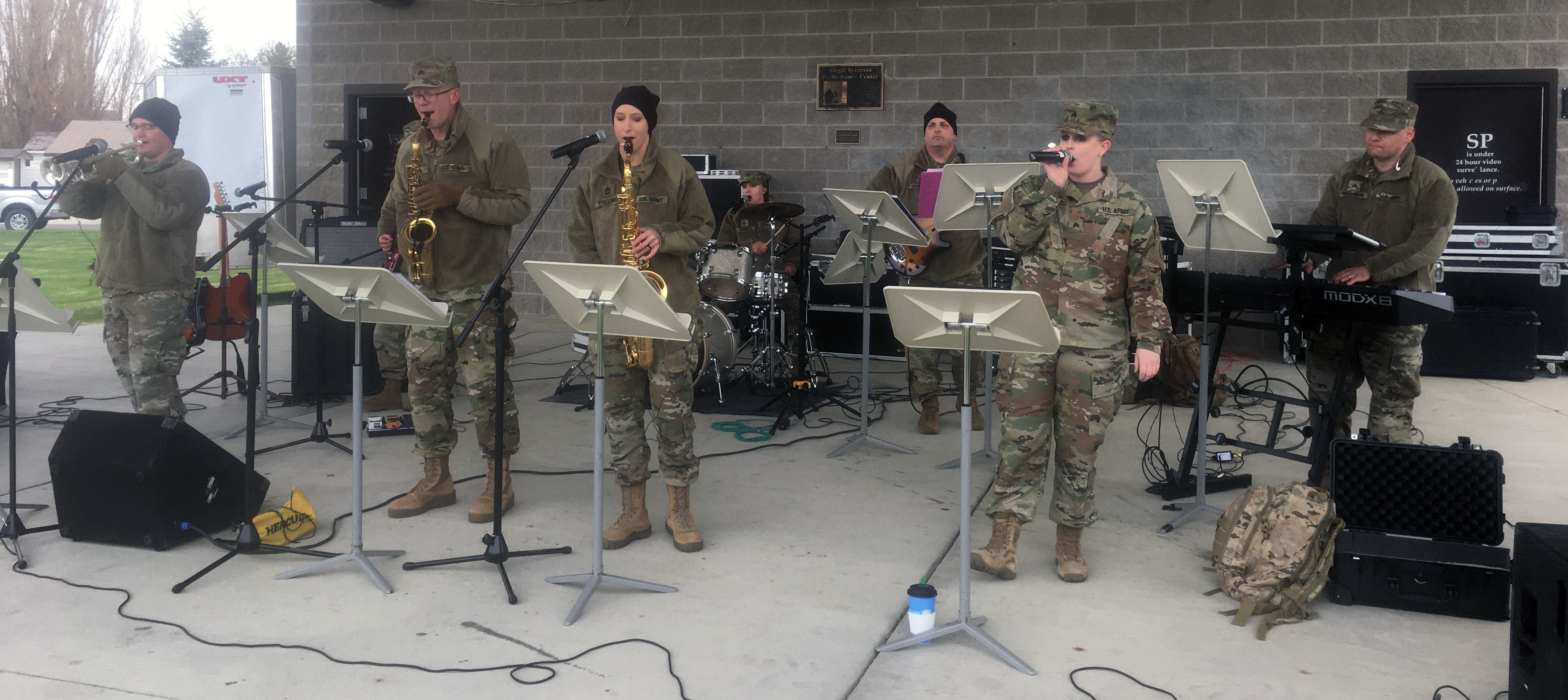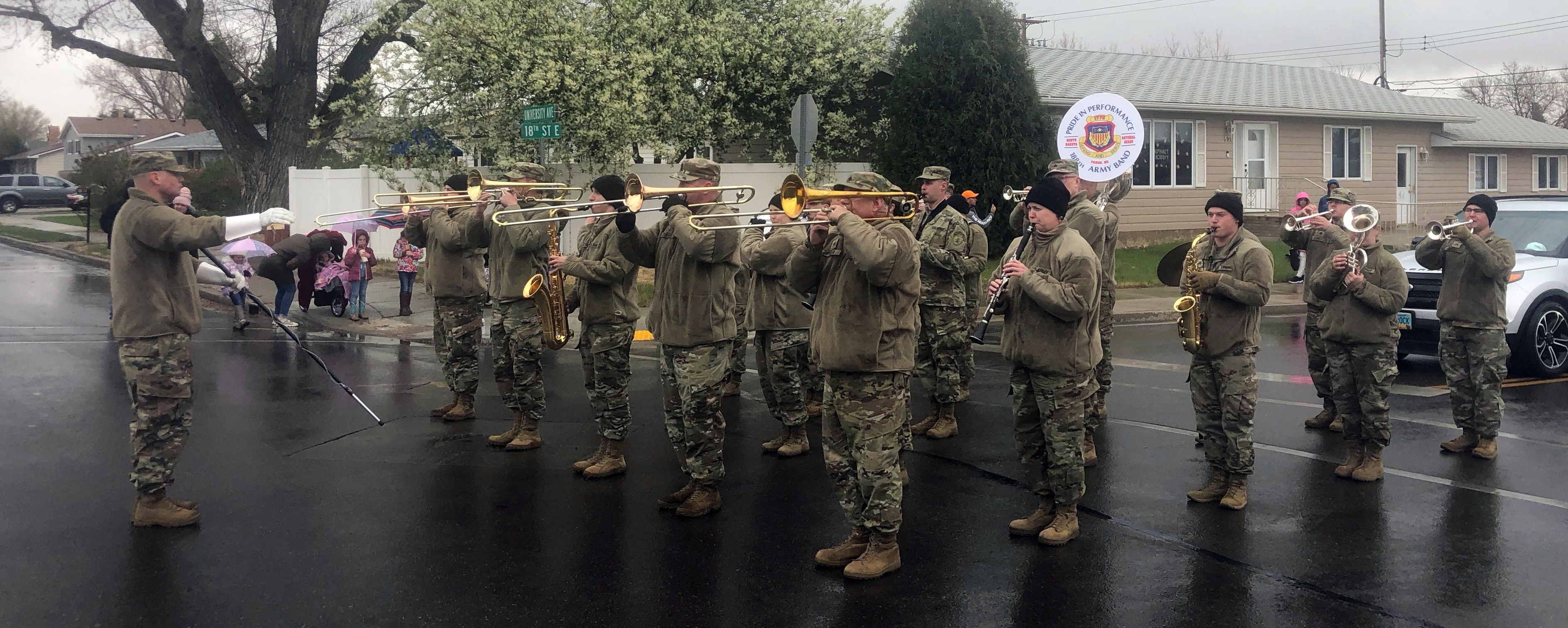 Despite the cold, wind and rain, the Soldier musicians entertained Williston residents by performing an assortment of different styles of music by performing in two separate musical groups: Full Battle Rattle Brass Quintet and the Blues in Green variety band. The highlight performance was the 188th Marching Band as it led the Williston Band Day parade performing three pieces: The Army Song, Black Jack March, and Hosts of Freedom.