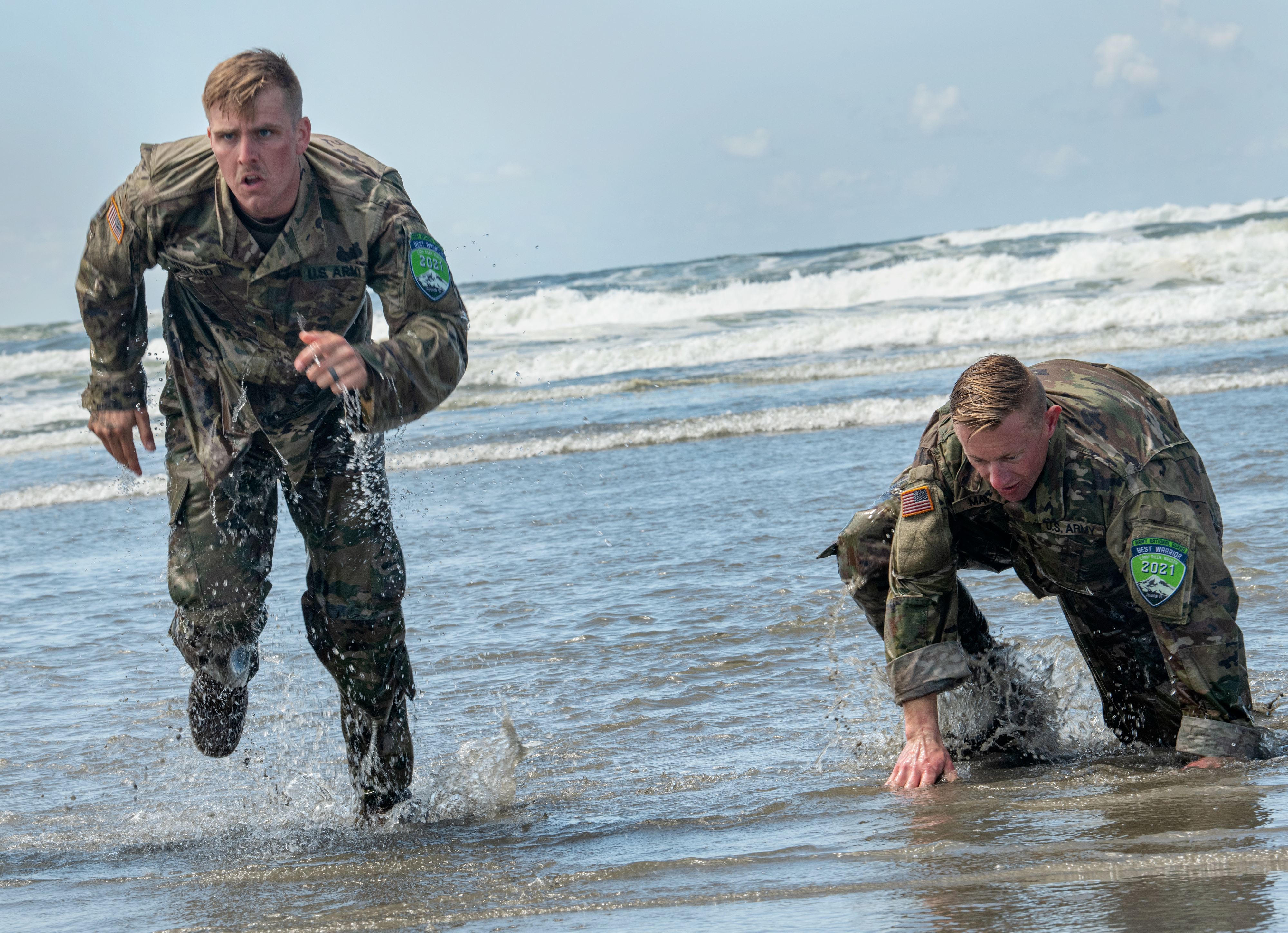 North Dakota Army National Guard Sgt. Brandon Wendland, left, and Oregon Army National Guard Sgt. John Mayer, take on the final event of the 2021 Region VI Best Warrior Competition, “Omaha Beach” at Camp Rilea, Warrenton, Oregon, May 7, 2021. (National Guard photos by Master Sgt. John Hughel, Oregon Military Department Public Affairs)