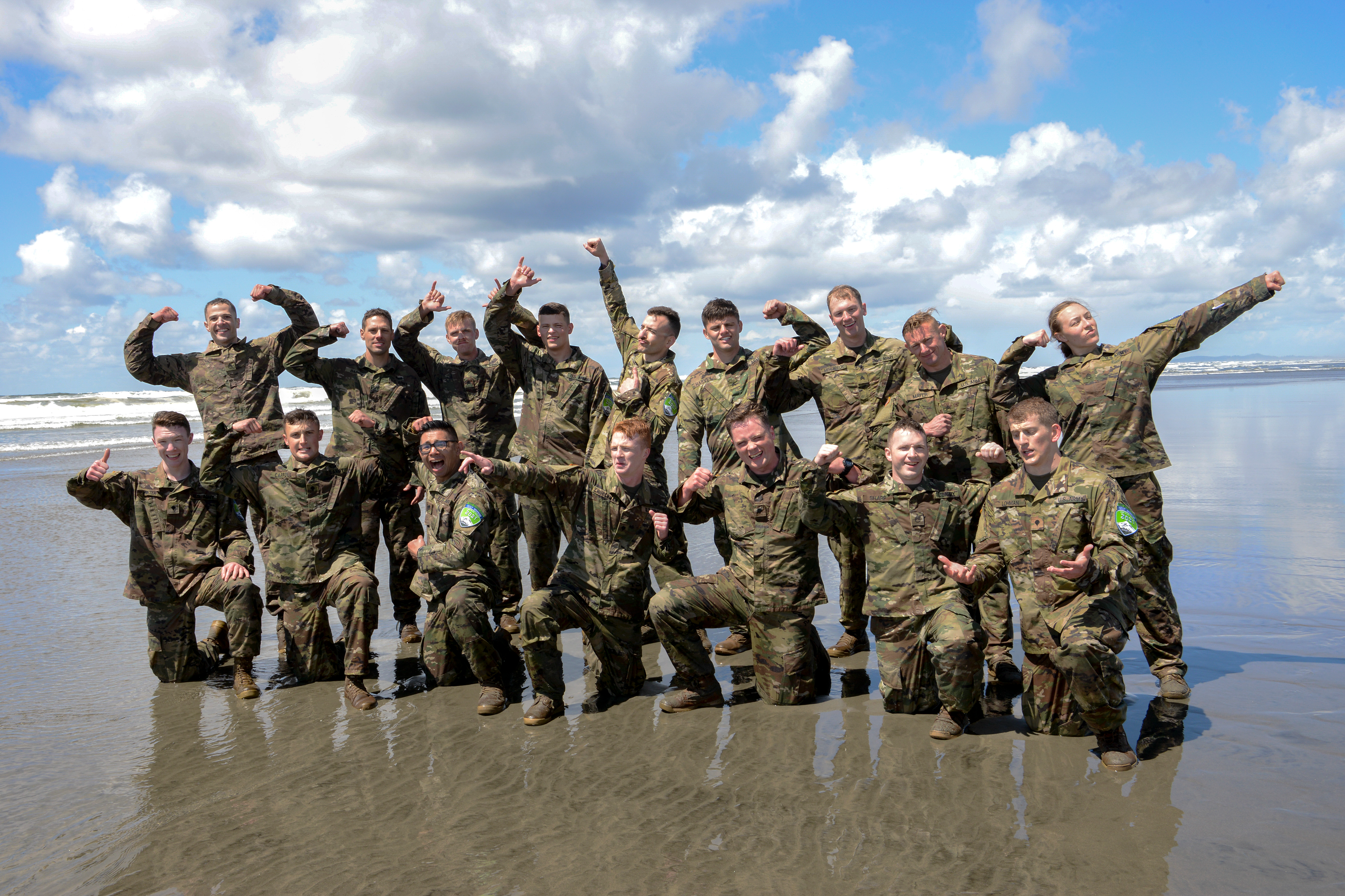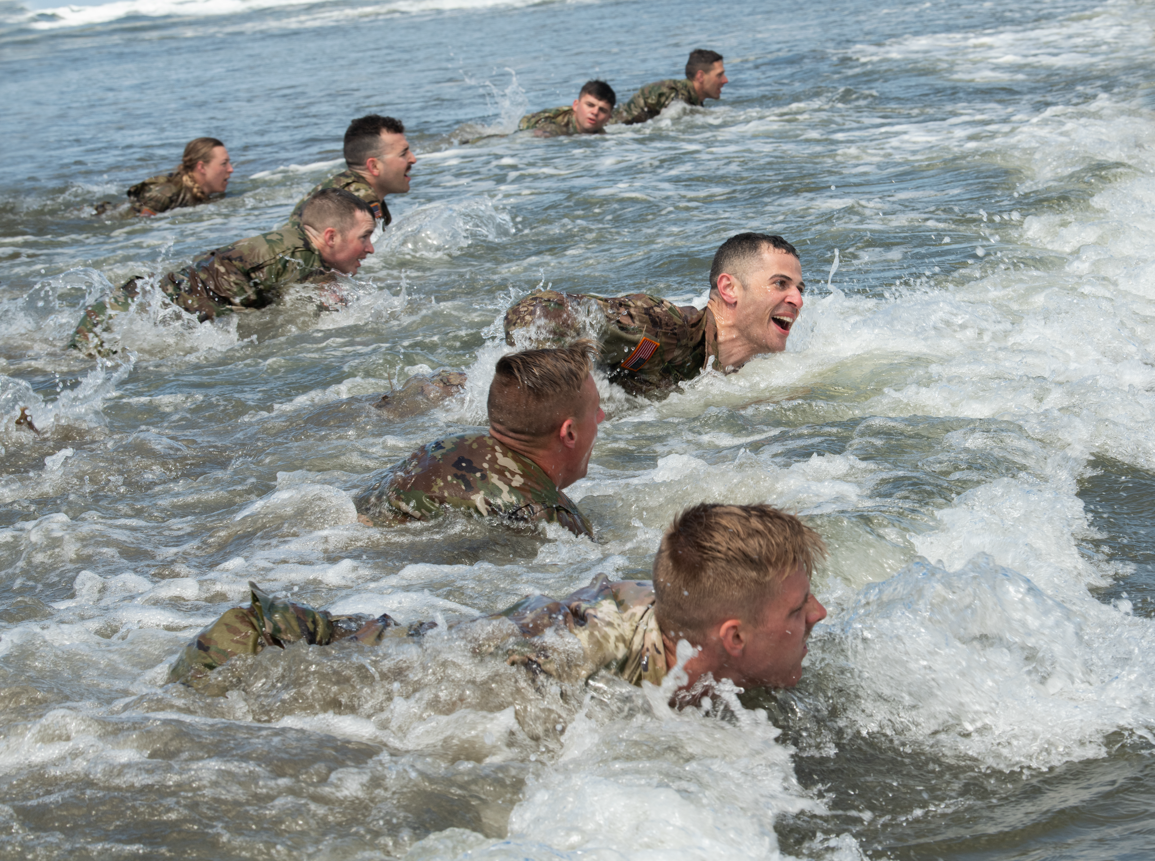 Army National Guard Soldiers participating in the Region VI 2021 Best Warrior Competition celebrate completing their last event, “Omaha Beach,” along the Pacific Ocean at Camp Rilea, Warrenton, Oregon, May 7, 2021. (National Guard photo by Master Sgt. John Hughel, Oregon Military Department Public Affairs)