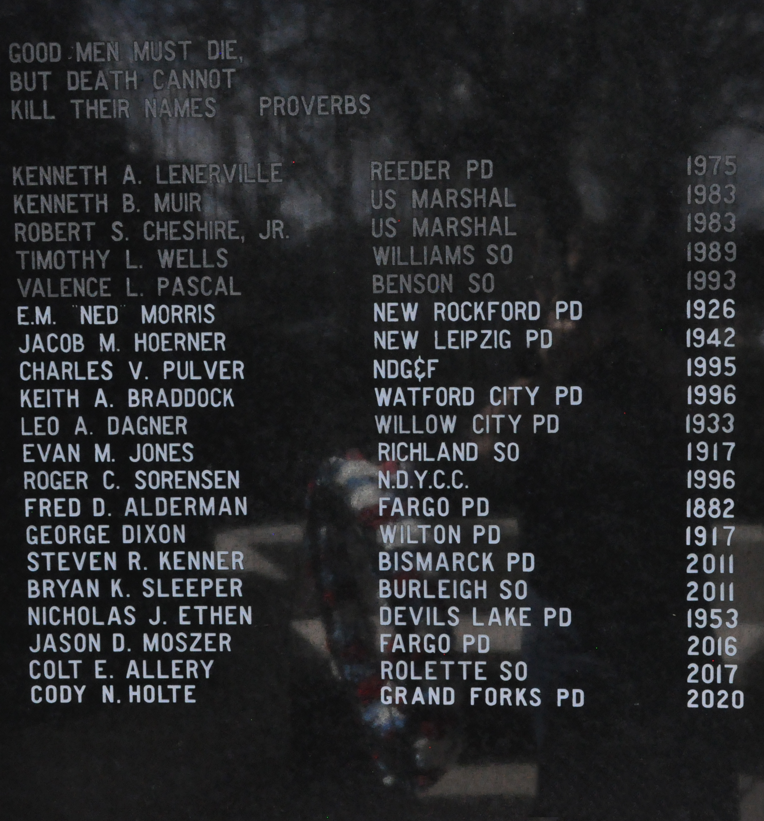 During the ceremony, Cody N. Holte's name was added to the memorial's wall of honor. Holte, a Grand Forks police officer who lost his life on May 27, 2020 in the line of duty, also served as a lieutenant in the N.D. Army National Guard. Among the guest speakers was the Grand Forks Police Department's chief of police Mark Nelson, a retired command sergeant major who served as the N.D. National Guard's senior enlisted leader.