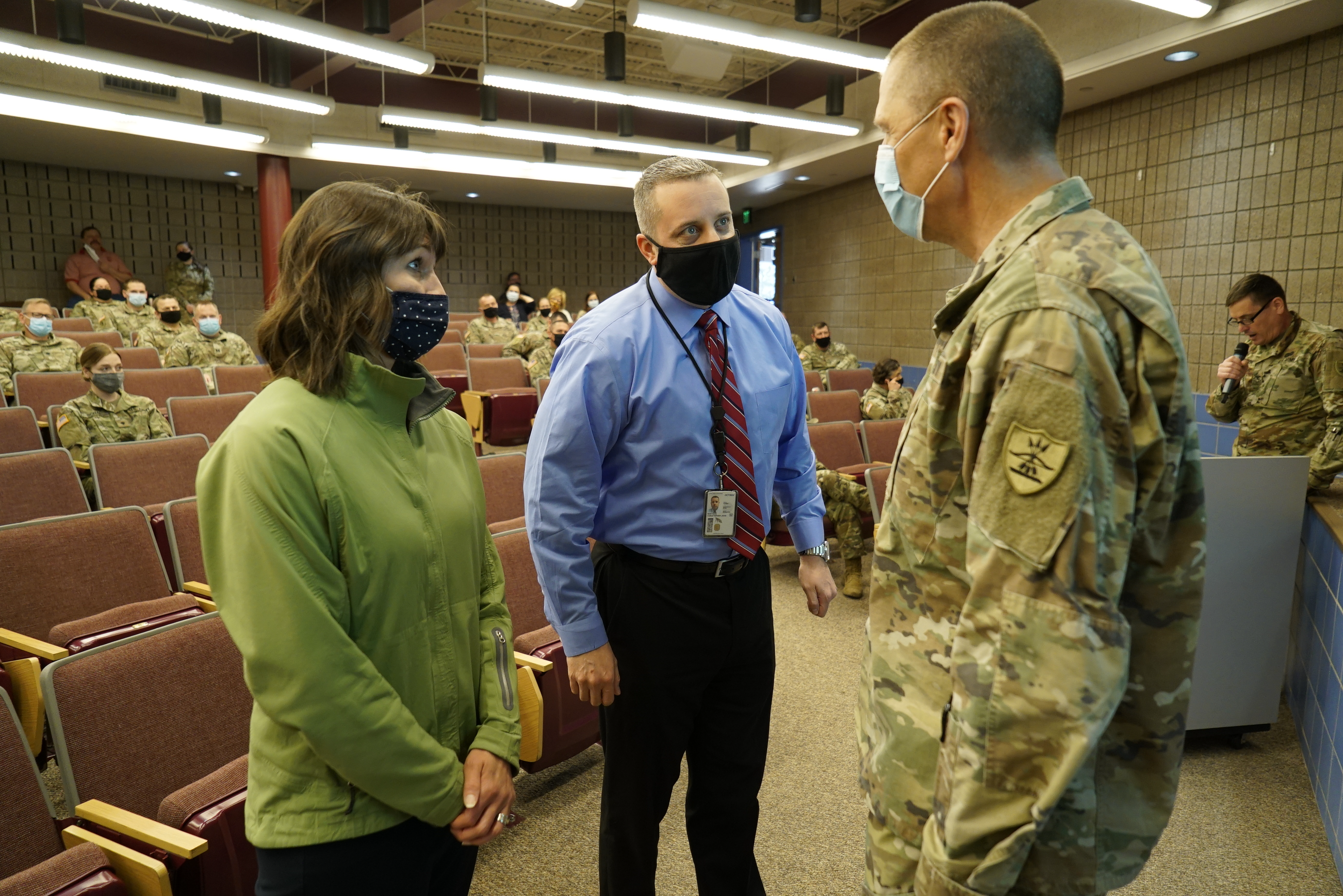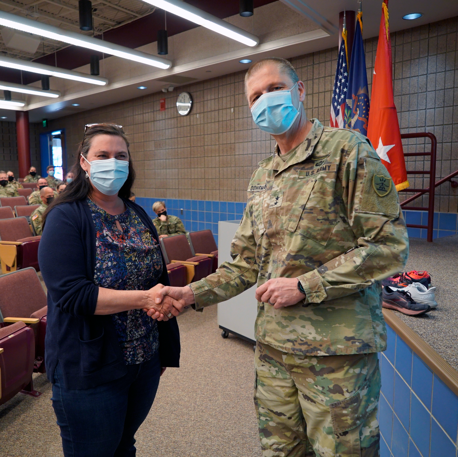 After professional development classes, Maj. Gen. Al Dohrmann, N.D. adjutant general, awarded three N.D. National Guard civilian employees command coins in recognition of their recent significant achievements at the Raymond J. Bohn Armory in Bismarck, May 12, 2021. Michelle Panos was honored for taking the lead and acting as the conduit between Fargo V.A. and the N.D. National Guard in providing safe areas to conduct COVID-19 vaccination clinics state-wide. Jennifer Scheet and Chris Martens were recognized for their roles in supporting the N.D. National Guard's efforts during the state's 67th Legislative Session.