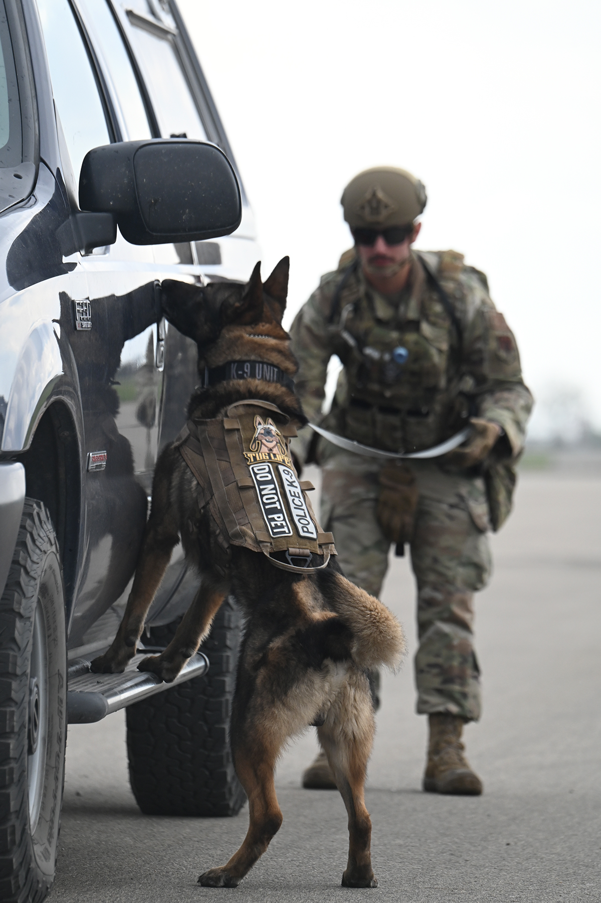 U.S. Air Force Senior Airman Austin Dragoo, a military working dog (MWD) handler in the 319th Security Forces Squadron, Grand Forks Air Force Base, works as a team with his dog during a mass odor detection training scenario at the North Dakota Air National Guard regional training site, May 13, 2021.