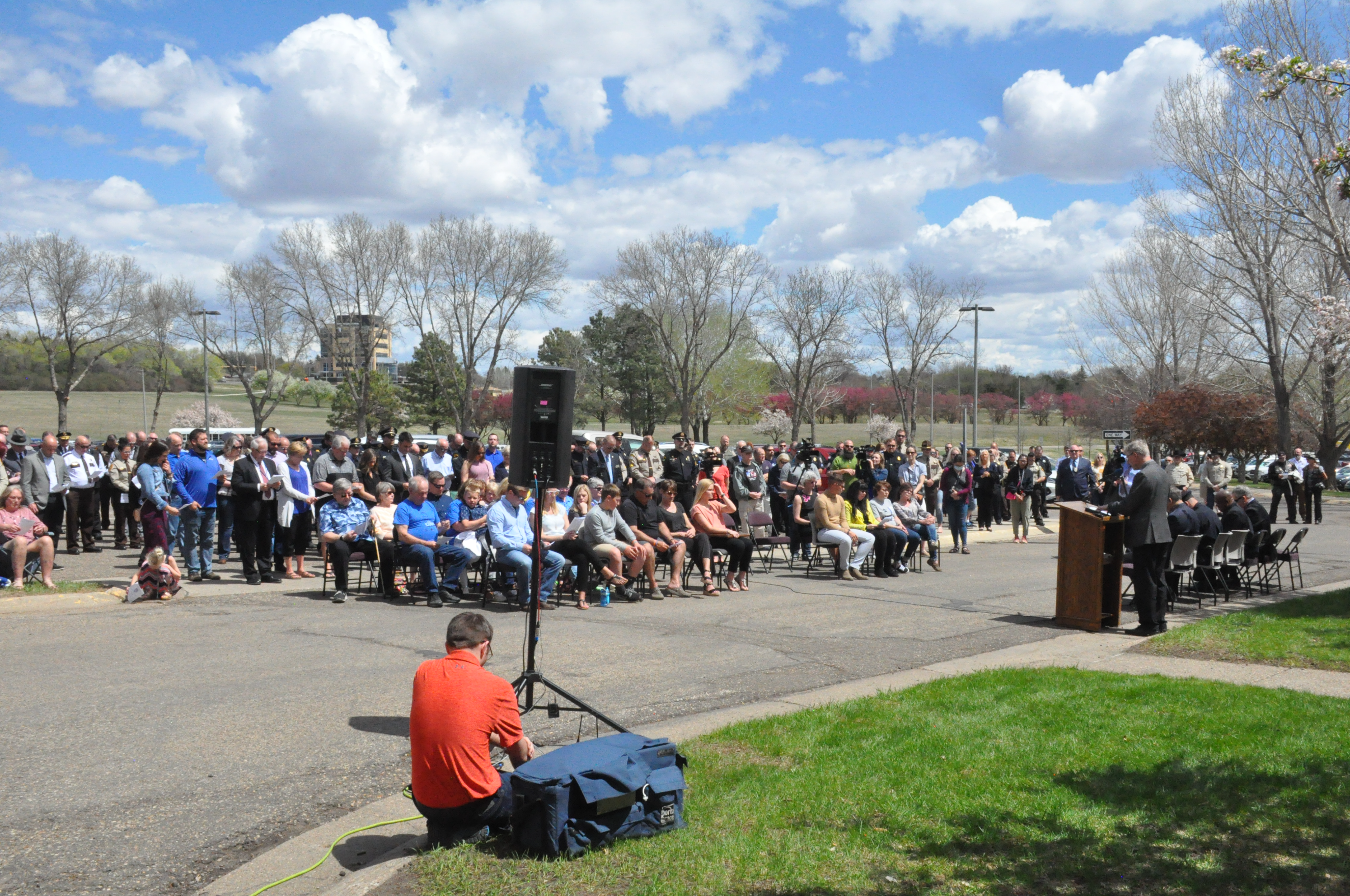 About 250 people gathered at the state capitol's North Dakota Peace Officer Memorial, May 13, 2021, to witness the annual Peace Officer Memorial Day ceremony. (National Guard story and photos by Bill Prokopyk, N.D. National Guard Public Affairs)