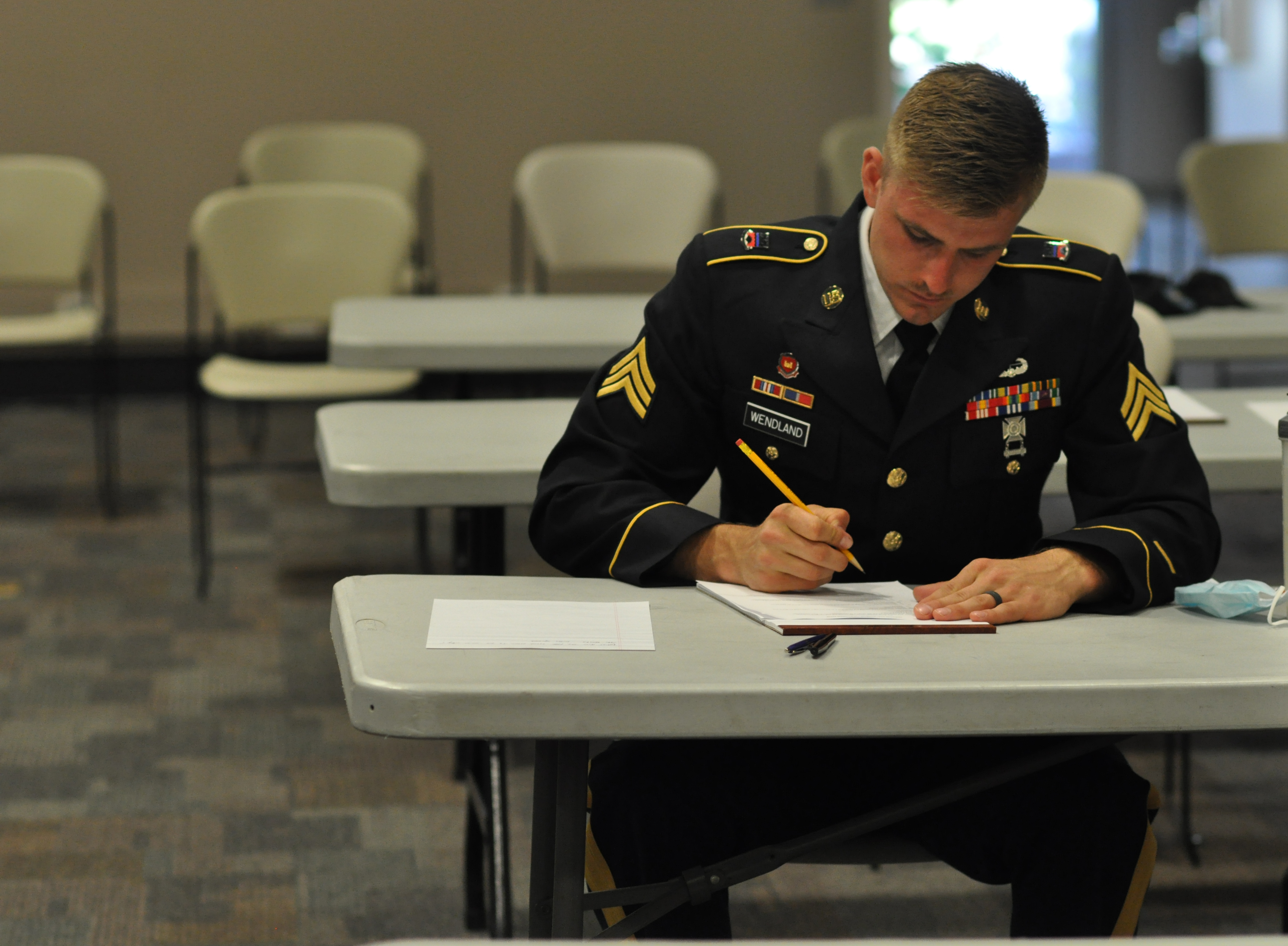 Sgt. Brandon Wendland, 957th Engineer Company, completes his essay on what the non-commissioned officers creed means to him and why during the 2021 Region Six Best Warrior Competition at Camp Rilea, near Warrenton, Oregon, May 4, 2021. (National Guard photos by Maj. Leslie Reed, 115th Mobile Public Affairs Detachment).