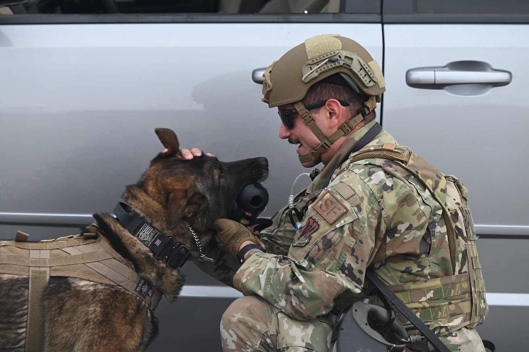U.S. Air Force Senior Airman Austin Dragoo, a military working dog (MWD) handler in the 319th Security Forces Squadron, Grand Forks Air Force Base, praises his dog during a mass odor detection training scenario at the N.D. Air National Guard regional training site May 13, 2021.