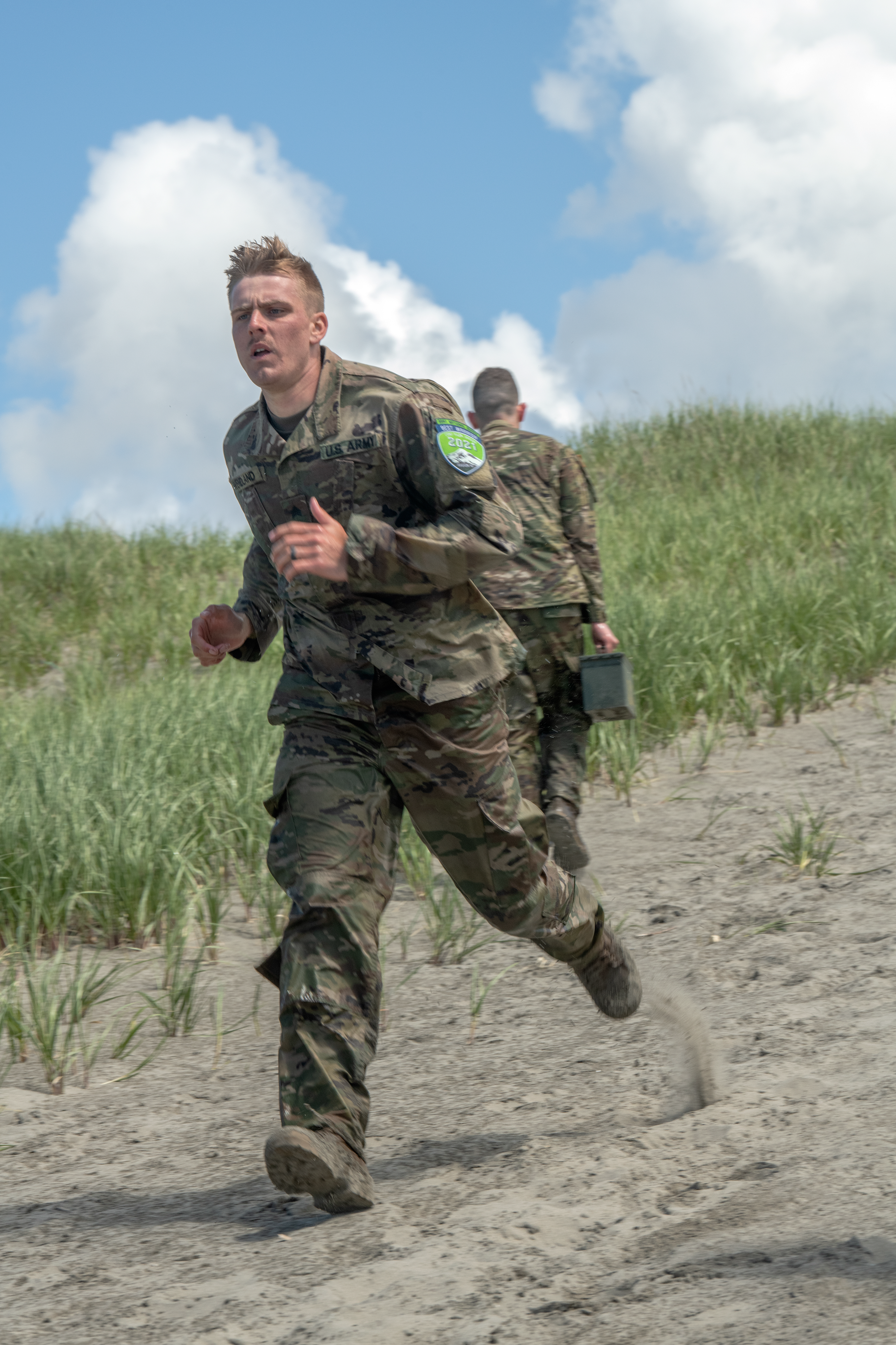 The Region VI BWC was comprised of nearly 20 events which tested a wide range of skills, from the Soldiers’ military appearance and knowledge to their physical strength and endurance. Soldiers proved themselves on weapon qualifications, long ruck marches, land navigation and obstacle courses. The participants were tested with limited rest and sleep. The culminating challenge was an “Omaha Beach” event, in which the Soldiers ran from the Pacific Ocean to a station where they grabbed two heavy ammunition canisters over the high sand dunes, then turned around and sprinted to the finish.