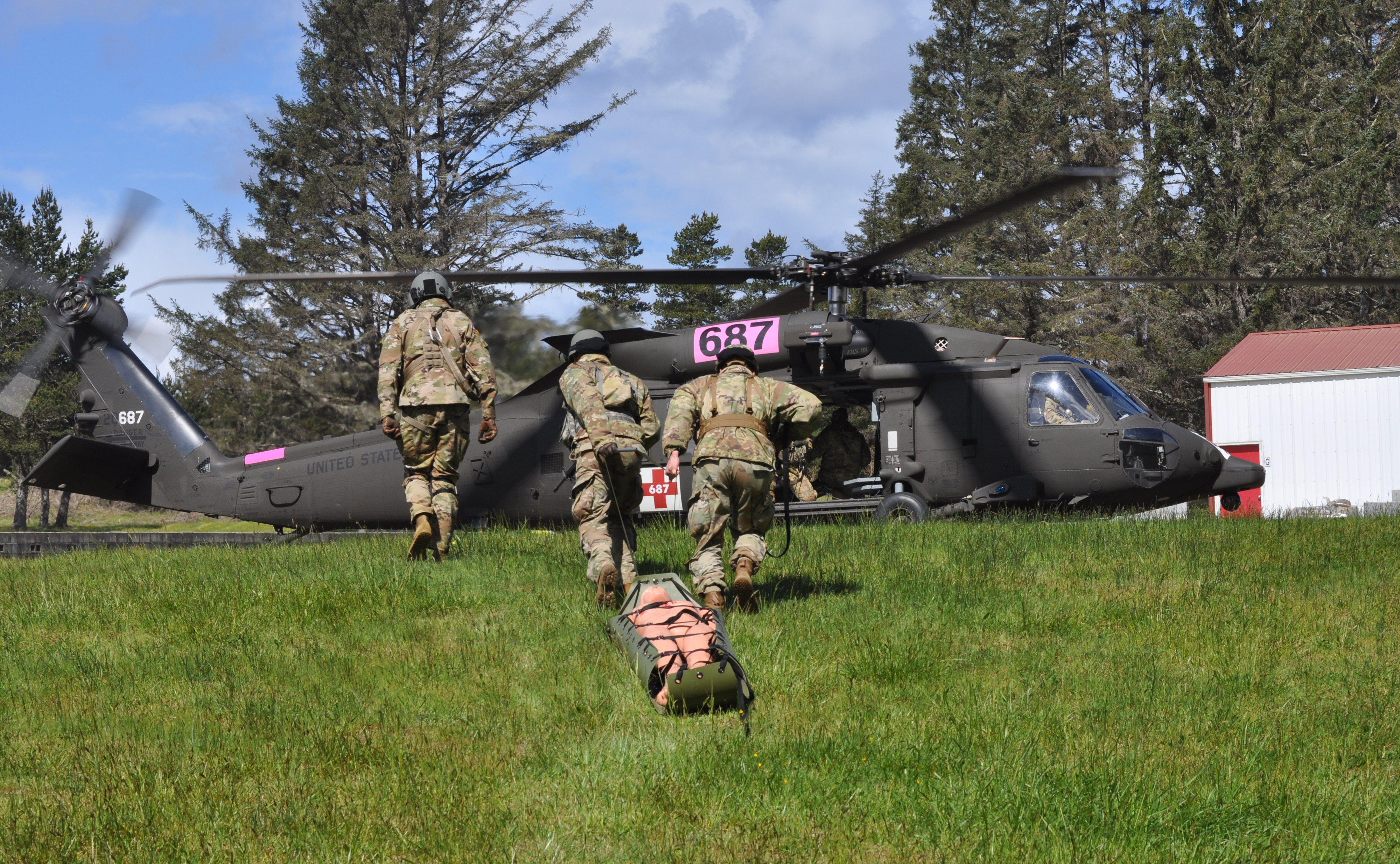Sgt. Brandon Wendland, left, and Cpl. Andrew Doss of the North Dakota Army National Guard, use a litter to transport a simulated casualty to an Oregon Army National Guard Black Hawk helicopter for medical evacuation during the 2021 Region VI Best Warrior Competition at Camp Rilea, near Warrenton, Oregon, May 7, 2021. Competitors performed first aid, transmitted a 9-line medical evacuation request and loaded the casualty into the helicopter. (National Guard photo by Maj. Leslie Reed, 115th Mobile Public Affairs Detachment)