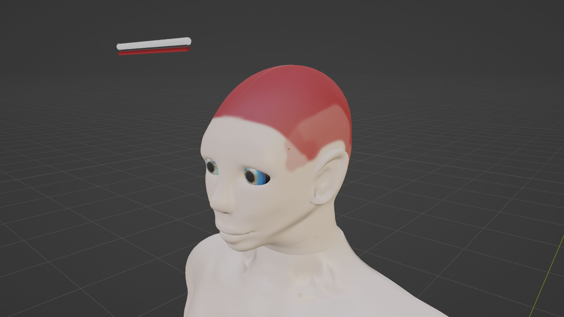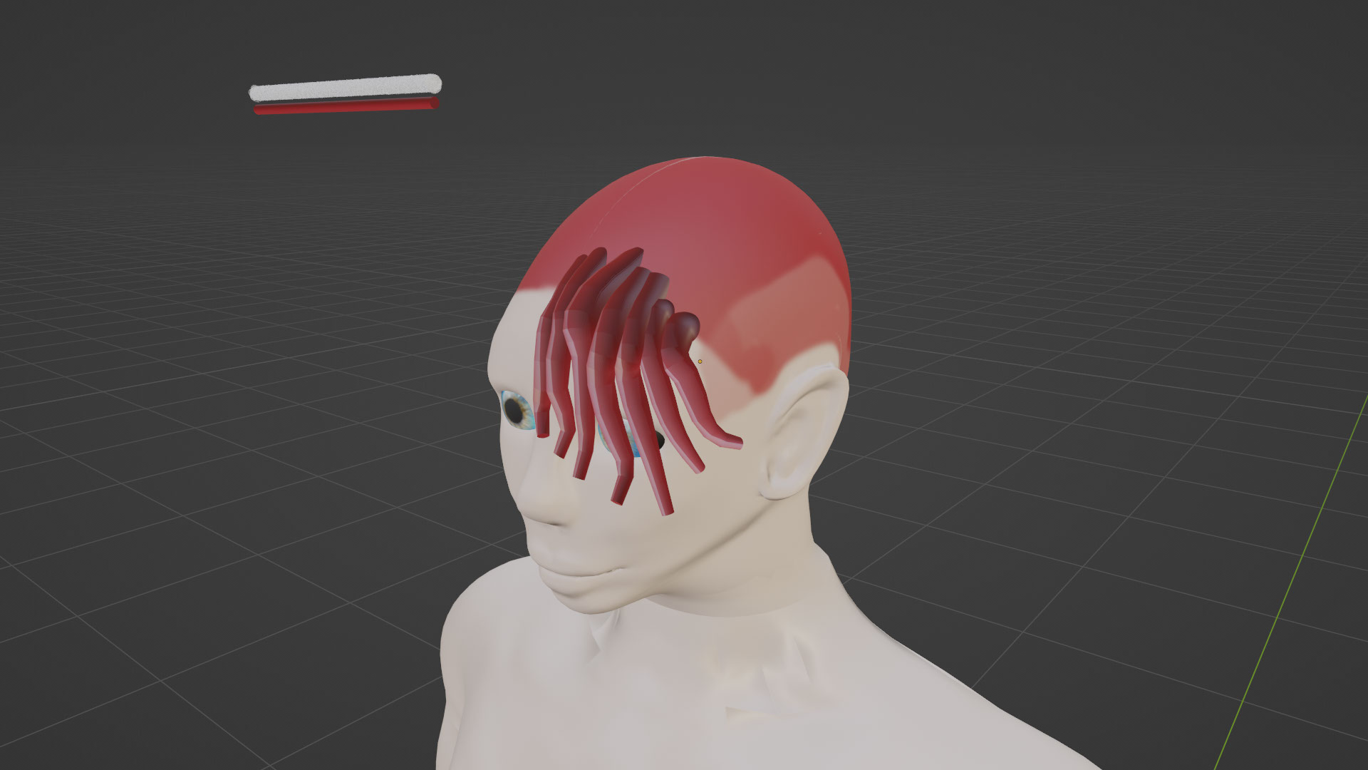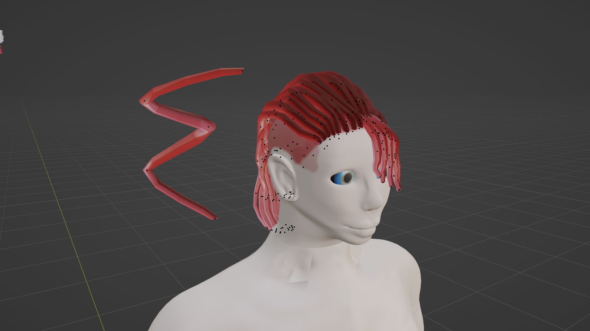 Next I began to work on the hair. I started by painting a simple rendition of the Kelpie's hairline and where the hair would go in relation. Splines are used to create the dreadlocks. Blender allows you to scale splines by their vectors, meaning I would have hair that varies in length and thickness where needed.